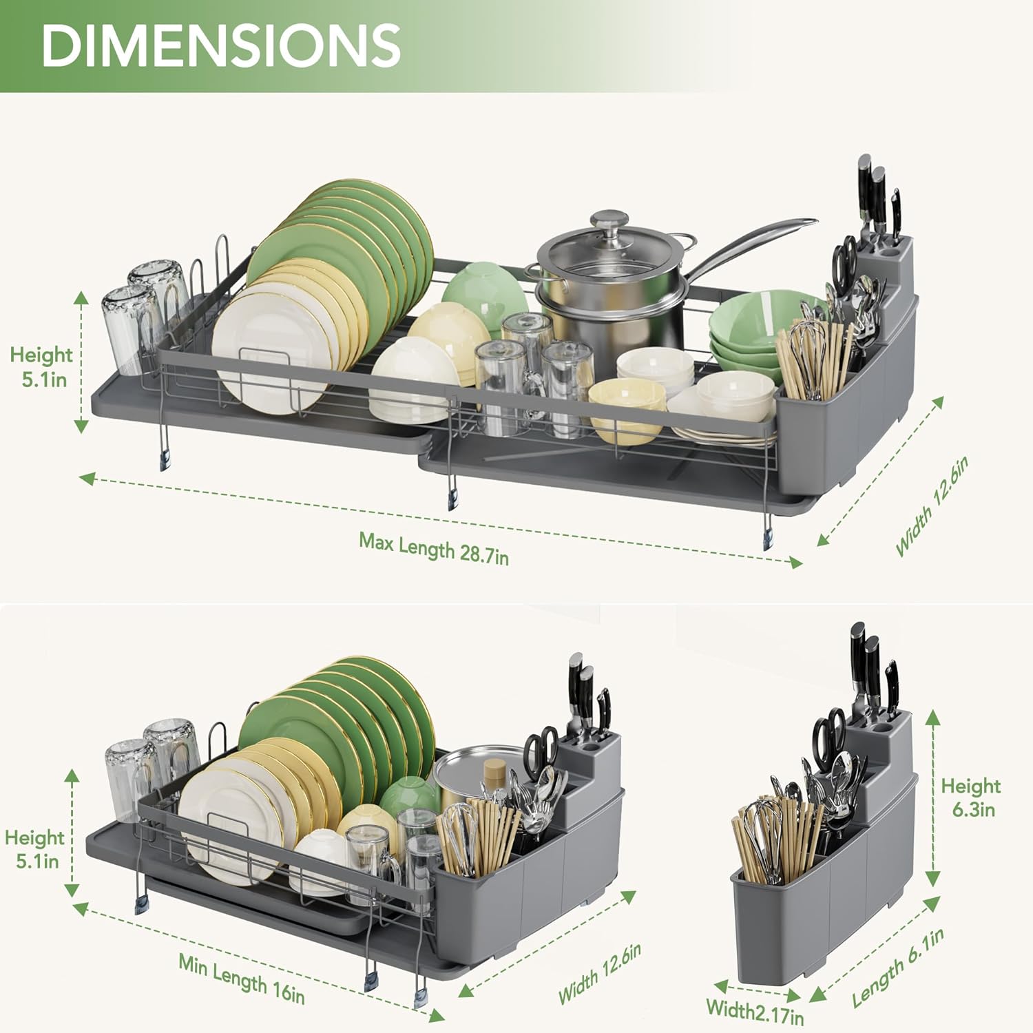 - Expandable Design:ROTTOGOON kitchen dish drying rack with an extendable design can be adjusted to fit different kitchens. It measures 12.6" W *5.1" H, and from 19.2" to 28.7" in length. This dish racks can accommodate plates, bowls, cups, glasses, and even full-sized pots and pans.Therefore, you can just adjust the extendable tray as you need.