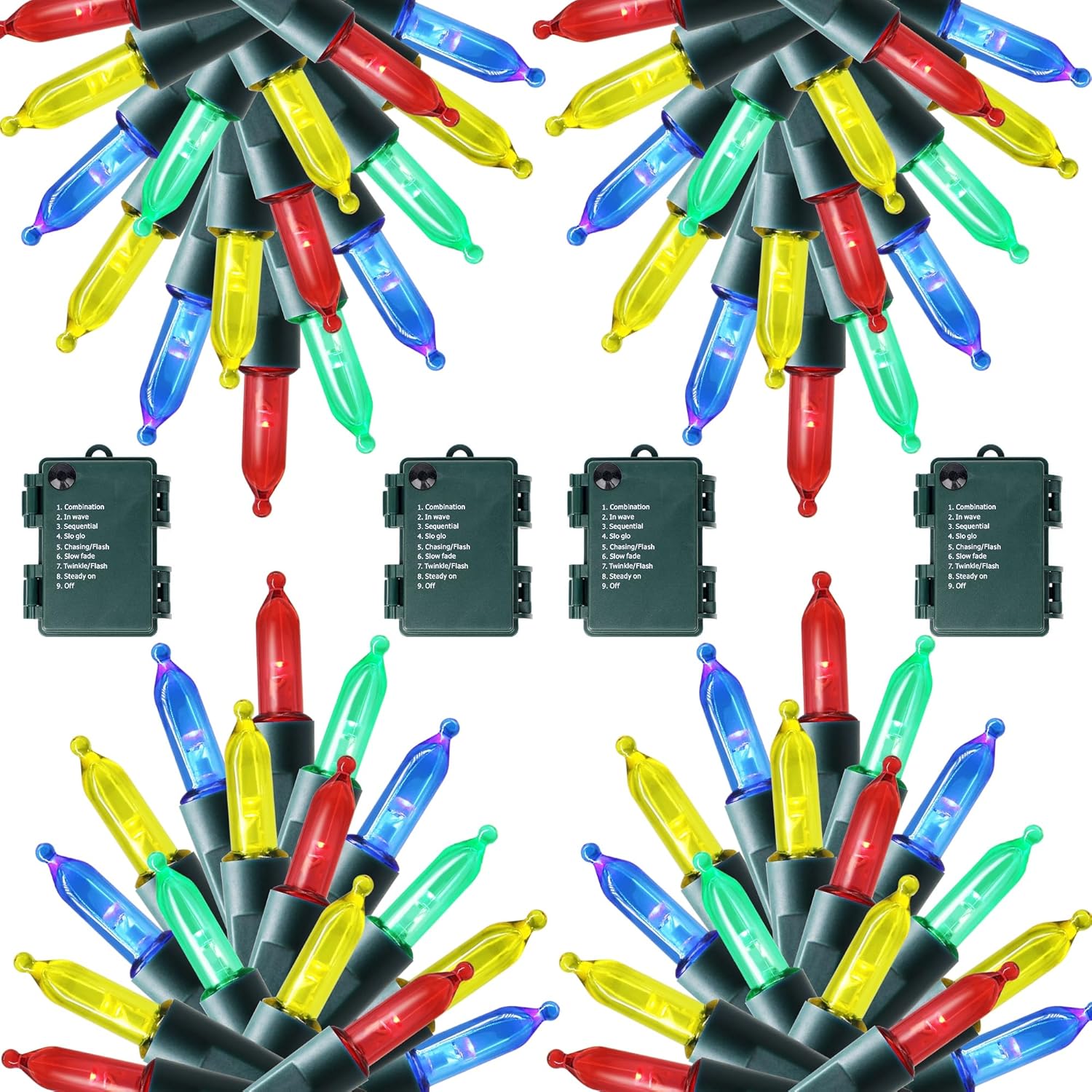 - BATTERY OPERATED WITH TIMER: 3 AA batteries are required for power supply (NOT INCLUDED). Press button on the battery case for 8 modes adjusting: COMBINATION, IN WAVES, SEQUENTIAL, SLOGS, CHASING/FLASH, SLOW FADE, TWINKLE/FLASH and STEADY ON. Just light up the light with any mode you like to create great festival holiday joy atmosphere.