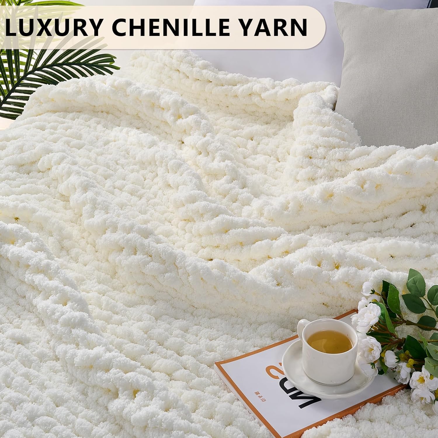 L'AGRATY Chunky Knit Blanket Throw: 80''x90'' Chenille Chunky Knitted Throw Blanket for Bed Couch - Handmade Thick Big Cable Knit Blanket - Large Chunky Crochet Blanket for Home Decor(Cream White)