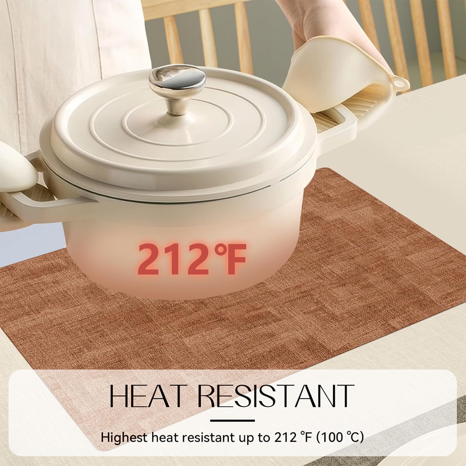 - HEAT-RESISTANT: Both sides are made of long-lasting and heat -resistant faux leather. the thickened placemats (0.12 inch/ 0.3 cm) ensure the heat won’t transfer to your cherish table. Highest heat-resistant can amount to 212 °F (100 °C), from leaving a white heat mark.