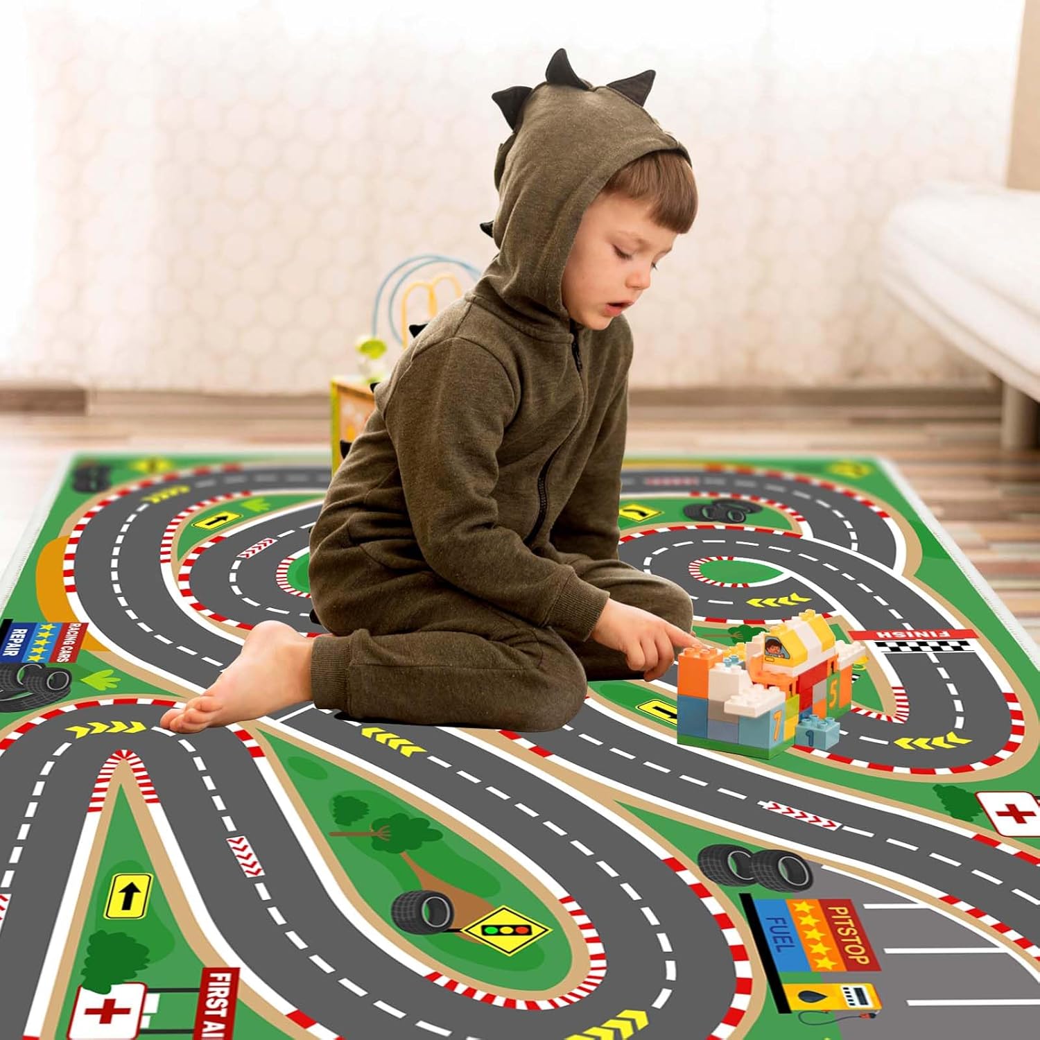 Kids Rug Play mat Playroom Rugs Car Rugs for Kids Toy Cars Race Track for Classroom Rug (Race-Green, 5.2x7.9ft)