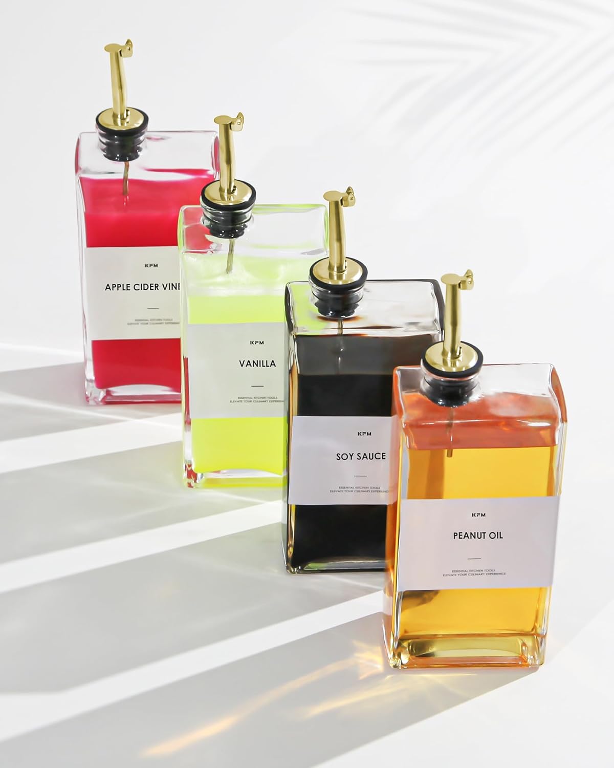 - ο·[12OZ/350ML Large Capacity Oil Dispenser Set]: With elegant rectangular olive oil dispenser bottle set enhance your kitchen decor also very pragmatic. This set includes two high-quality 12 oz (350 ml) glass bottles, four gold pourers, a funnel, and 35 designed labels and 5 blank labels for your custom use.
