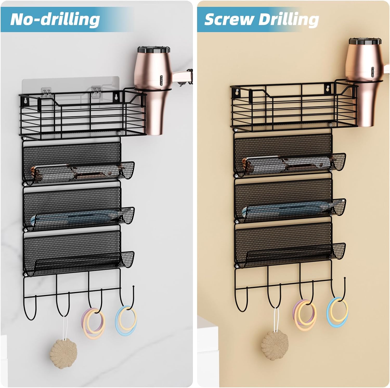 - 【Easy to Install/Use】The hair tool organizer can be hung in 2 ways: 1.Drilling screws make the hair tool rack fixed more firmly; 2.Intasll with the adhesive hook to protect the wall from damage.