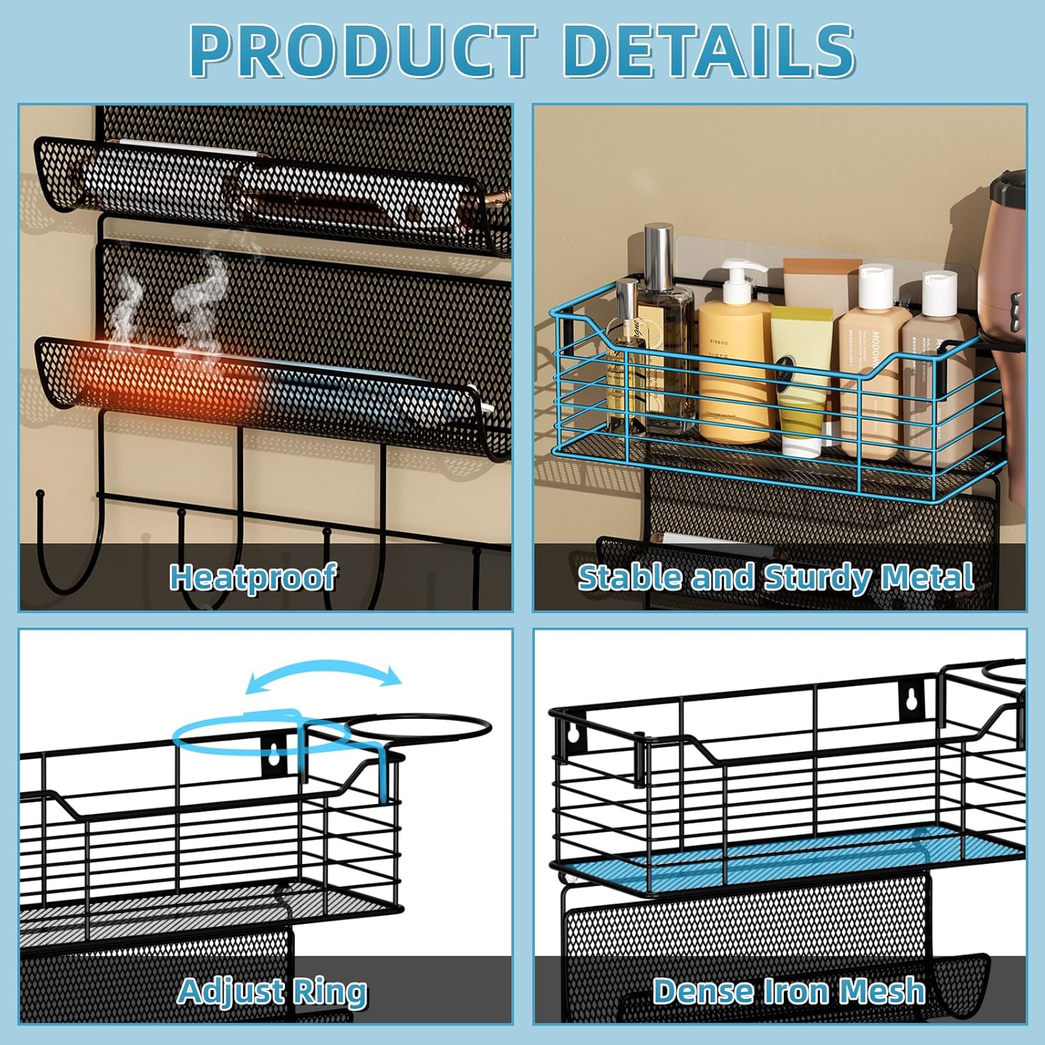 - 【1 Basket/4 tiers Shelf】The hair tool organizer includes 1 metal basket, 3 mesh holders, 1 hairdryer holder, and 1-row hook. Separate all your hair tools, such as curling iron, blow dryer, straightener, etc.