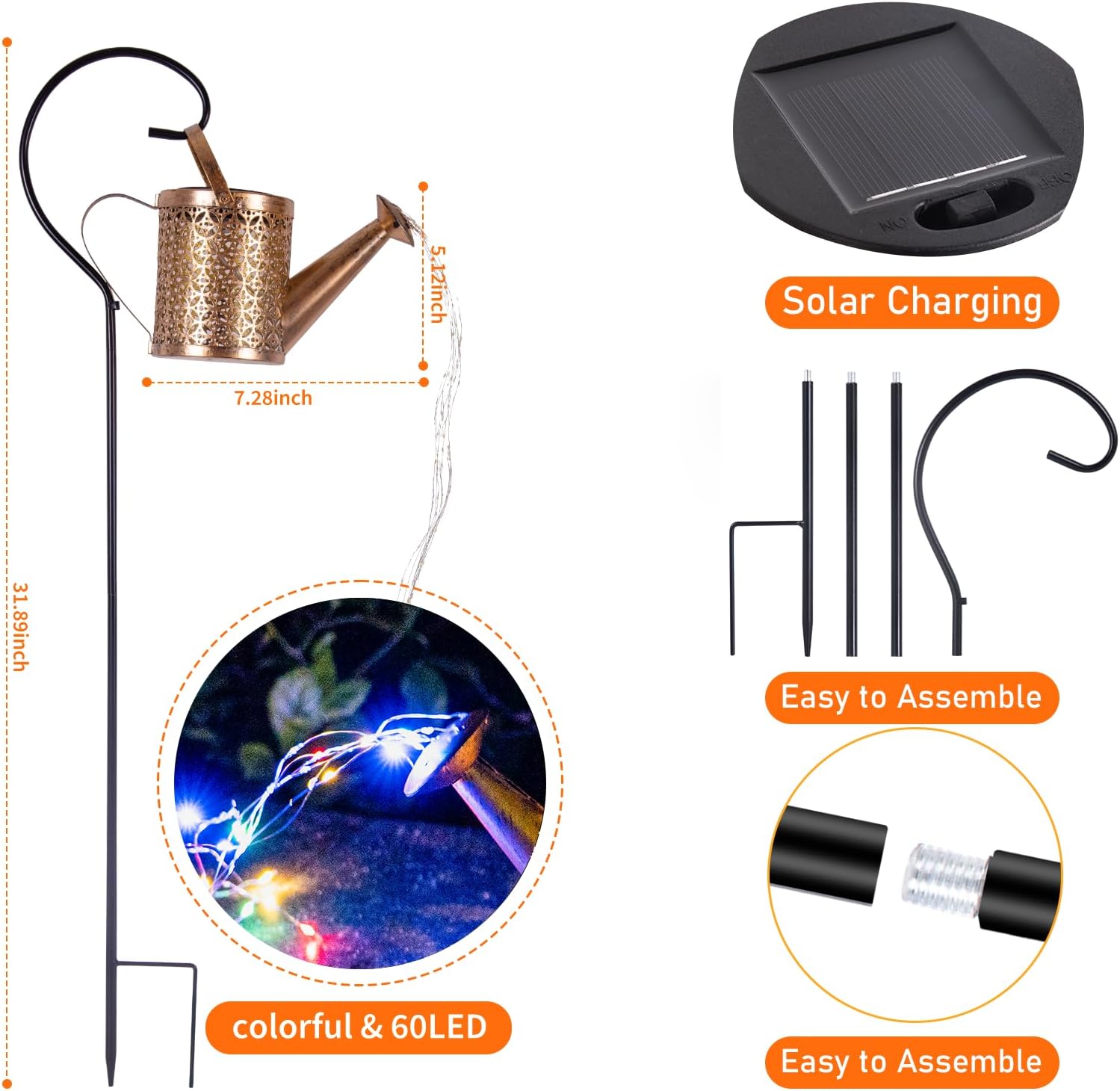 - Tool-Free Solar Watering Can Light: Installs in just 3 minutes with 3 simple steps: 1. Attach handle & hook 2. Insert into lawn 3. Hang the light. No wiring or external power needed.