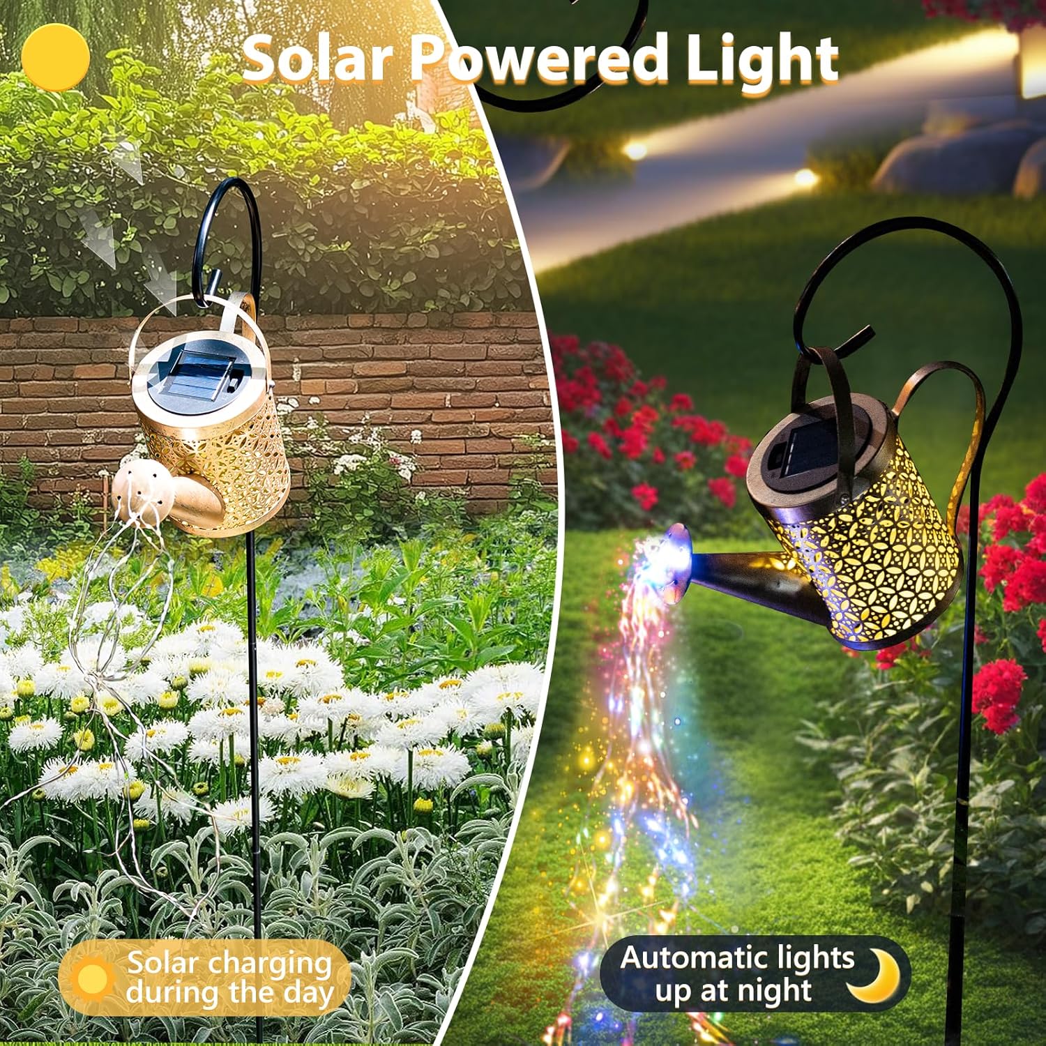 - Automatic & Energy Efficiency: This solar watering can light features a 1200mAh high-capacity battery and efficient solar panel. Just 6-8 hours of sunlight provides 10-12 hours of illumination. With smart light-sensing technology, it automatically turns on at dusk and off at dawn (keep switch ON), requiring no manual operation for energy-efficient performance.