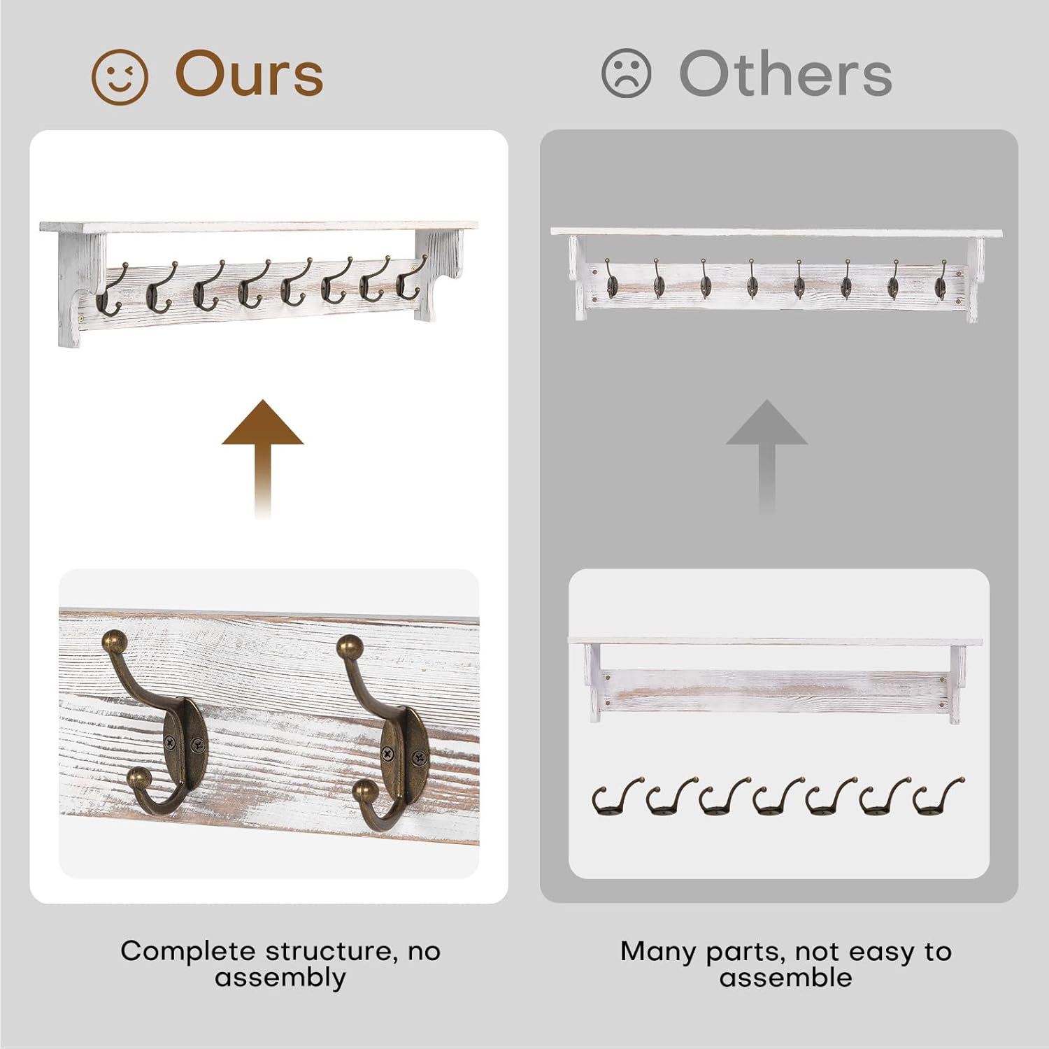 - Easy to Install: This coat rack wall mount with shelf is assembled, 8 metal hooks pre-installed, very easy to install on the wall, wall coat rack's packaging with detailed installation instructions and accessories, your installation will be very easy