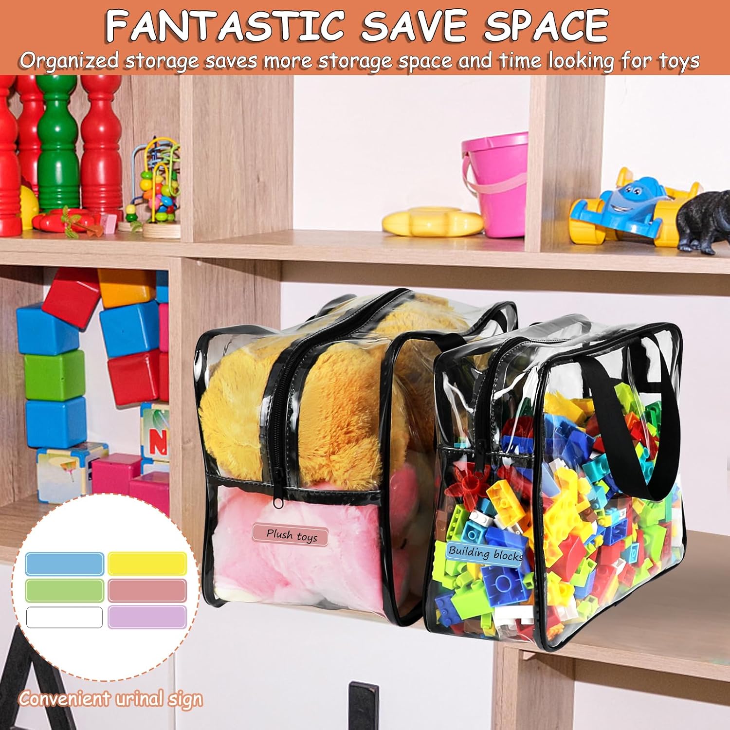 - ăHeart-Warming Designă: The toddler zipper storage bags for kids have an overall transparent design, so children can easily see and find the toys inside they want. Storage bags for toys have two handles, which have a stronger load-bearing capacity and are more sturdy for carrying toys, books, etc. when going out. Included name labels help you write names or store them in categories