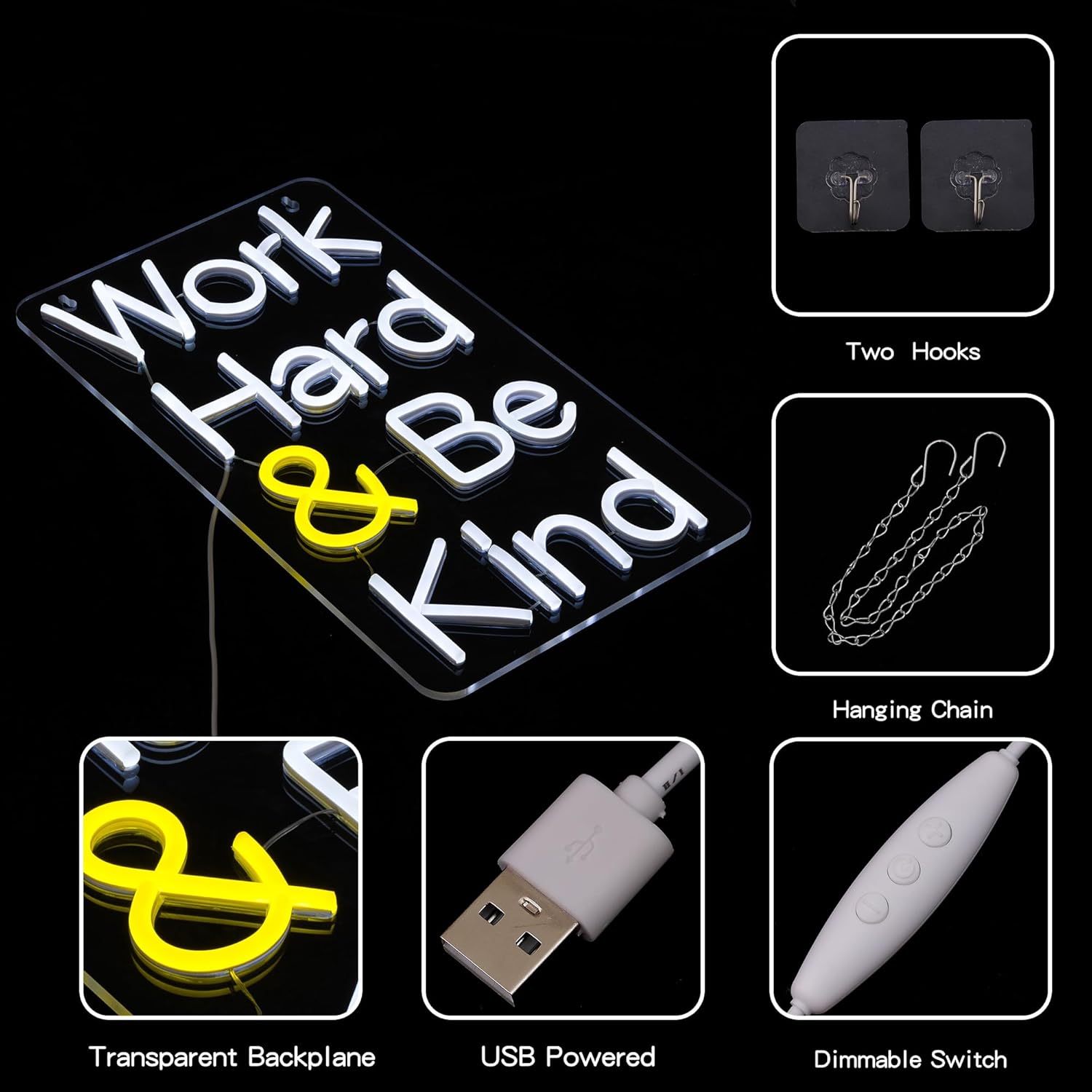 - Work Hard&Be Kind Neon Sign:Be kind neon signs is an inspirational phrase “work hard&be kind”. White letter neon sign lights up the space and is very motivating.