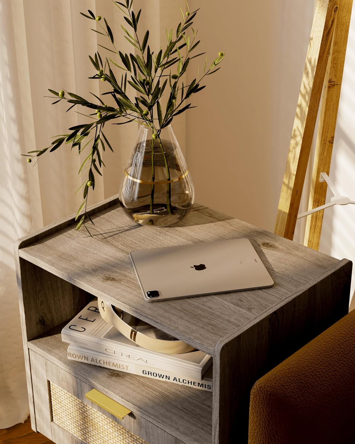 Rattan Nightstand,Modern Bedside Table with Storage Drawer and Open Wood Shelf, for Living Room, Bedroom and Small Spaces, Accent Night Stand with Solid Wood Legs, Easy Assembly(Grey Oak)