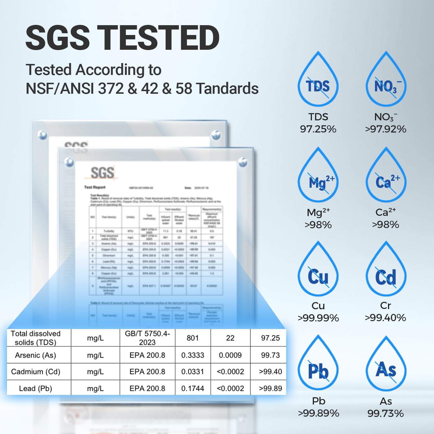 - 8 Stage Filtration: The reverse osmosis system features a 0.0001 ΞΌm membrane that effectively filters PFAS, heavy metals like lead, arsenic, and aluminum while the PCT filter enhances taste. This RO system is NSF/ANSI 58 certified for water assurance