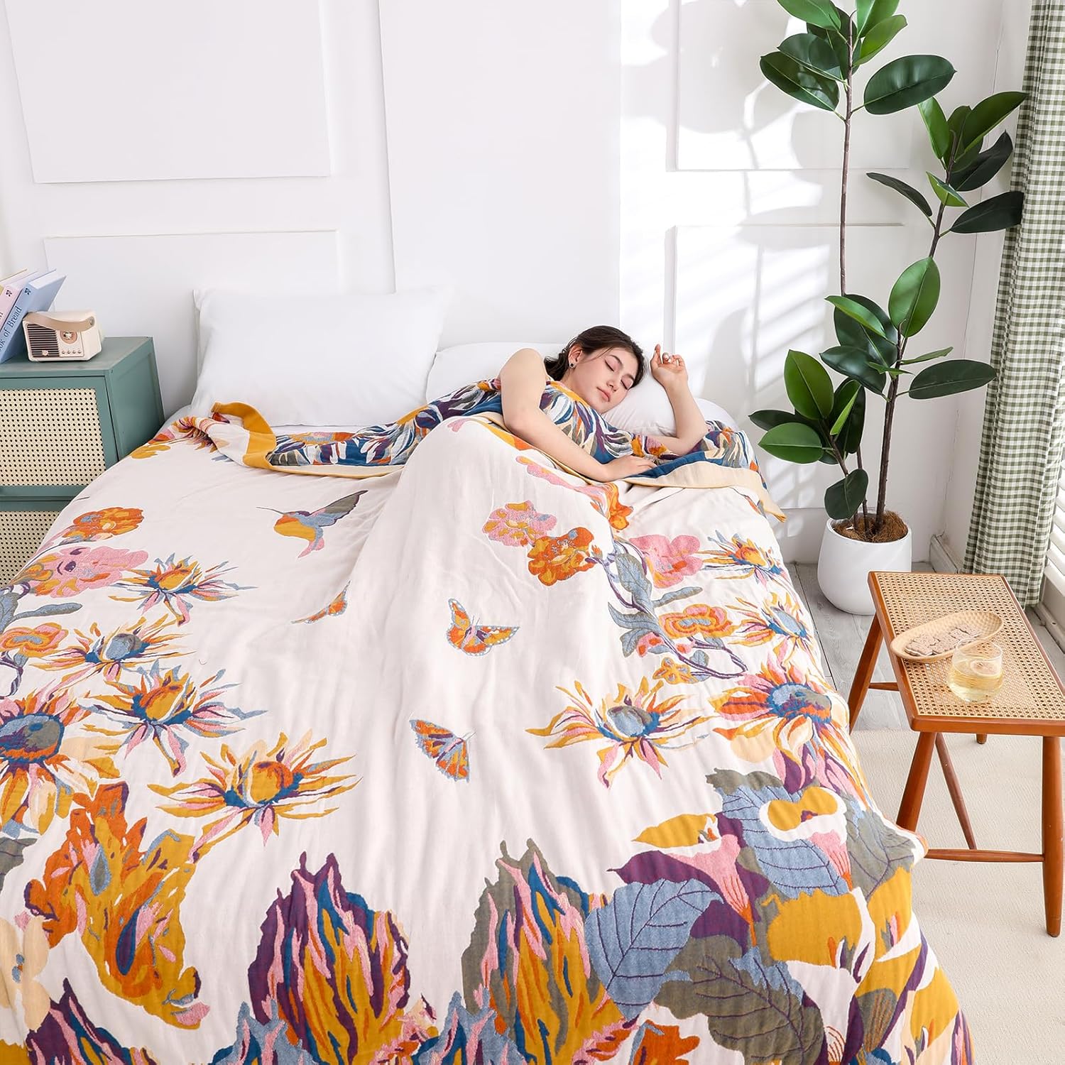 Snycler Boho Throw Blanket for Bed - 100% Cotton Ultra Soft Rustic Quilt - Watercolour Floral Printed Farmhouse Decor Bed Fall Blankets,80"×90" All Season Rustic Throw for Sofa Couch Chair
