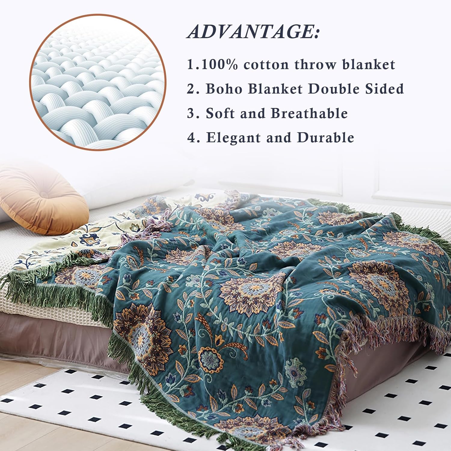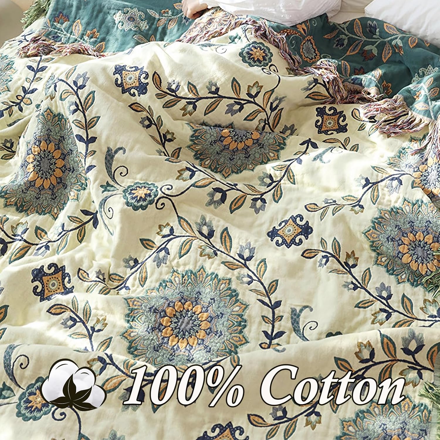 Snycler Boho Throw Blanket for Bed - 100% Cotton Ultra Soft Rustic Quilt - Blue Green Floral Printed Farmhouse Decor Bed Blankets, 80"×90" All Season Rustic Throw for Sofa Couch Chair