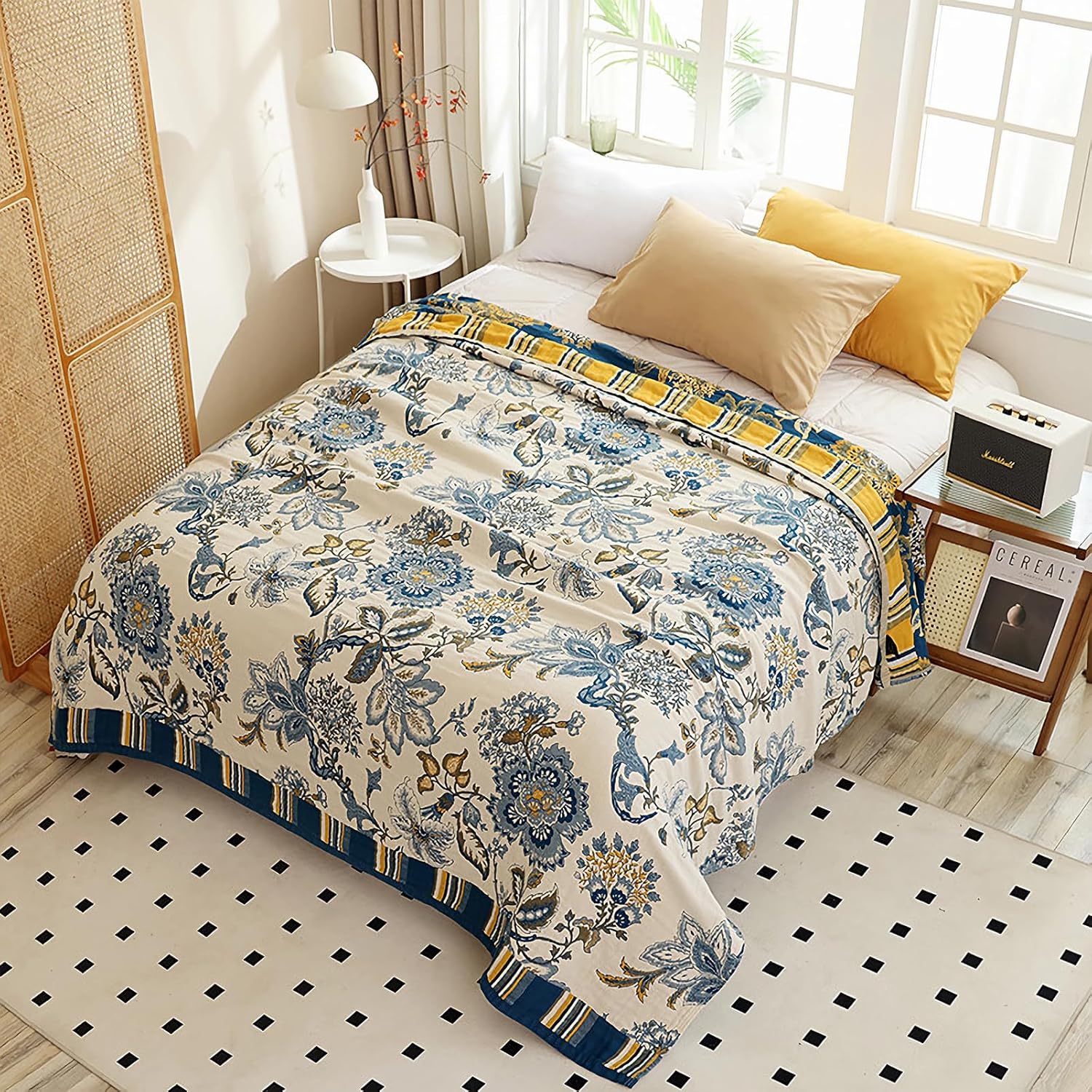 Snycler Boho Throw Blanket for Bed - 100% Cotton Ultra Soft Rustic Quilt - White Blue Floral Printed Farmhouse Decor Bed Blankets, 80"×90" All Season Rustic Throw for Sofa Couch Chair