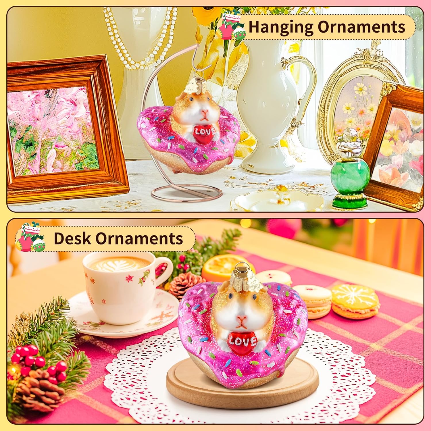 - Cute & Unique Design: Hand-blown glass christmas ornament adopts the image of a cute guinea pig. The golden guinea pig holds "love" and sits on a heart-shaped donut. It is cute and sweet. The whole is hand-painted, with exquisite craftsmanship, delicate and vivid image depiction. You can decorate any place you want to decorate, and believe it can be integrated well