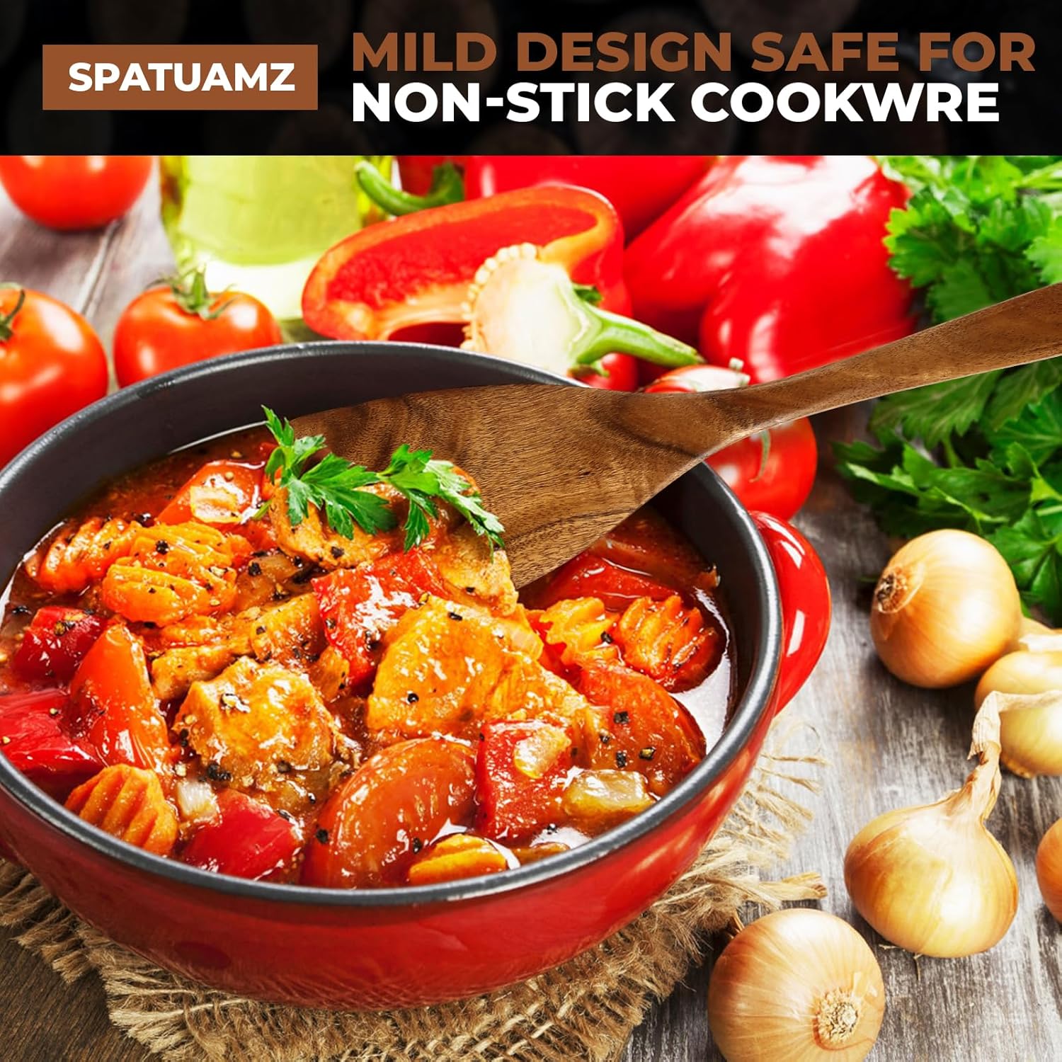 SPATUAMZ Wooden Cooking Spoons, Ladle and Spatula, Fine Polished Teak Wood Cooking Utensils Set of 6, Nonstick Wooden Kitchen Spoon & Spatula Set