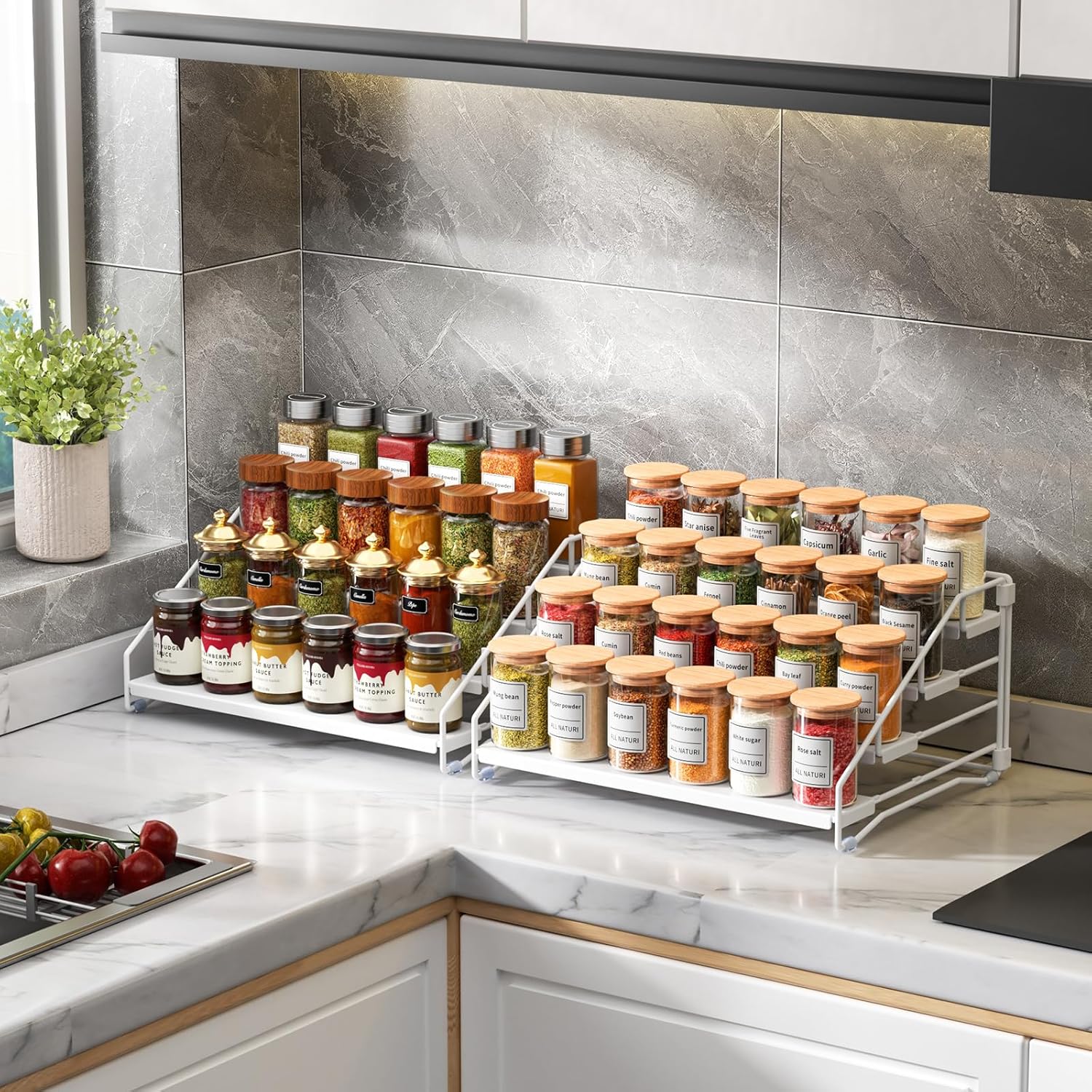 - 【Durable Metal,Strong And Sturdy】:The seasoning organizer rack made of high quality metal,sturdy frame and each tier has a sheet metal base design, provides spice bottles more stable to place and less to tip over. The surface of this cabinet organizer is smooth,with an anti-rust coating, and easy to clean with water or rag.