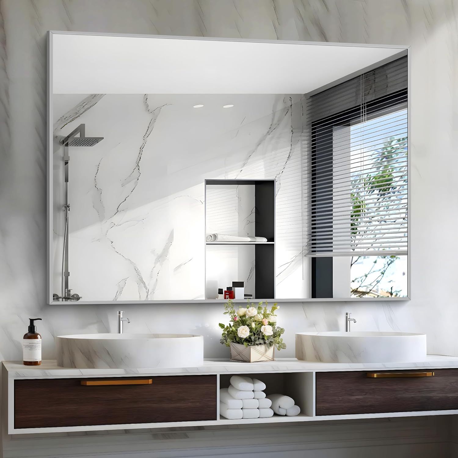 Silver Bathroom Mirror, 48"X36" Rectangle Mirrors for Wall Metal Frame, Bathroom Rectangular Mirror Modern Wall Mirror for Bedroom Living Room, Hangs Horizontal or Vertical