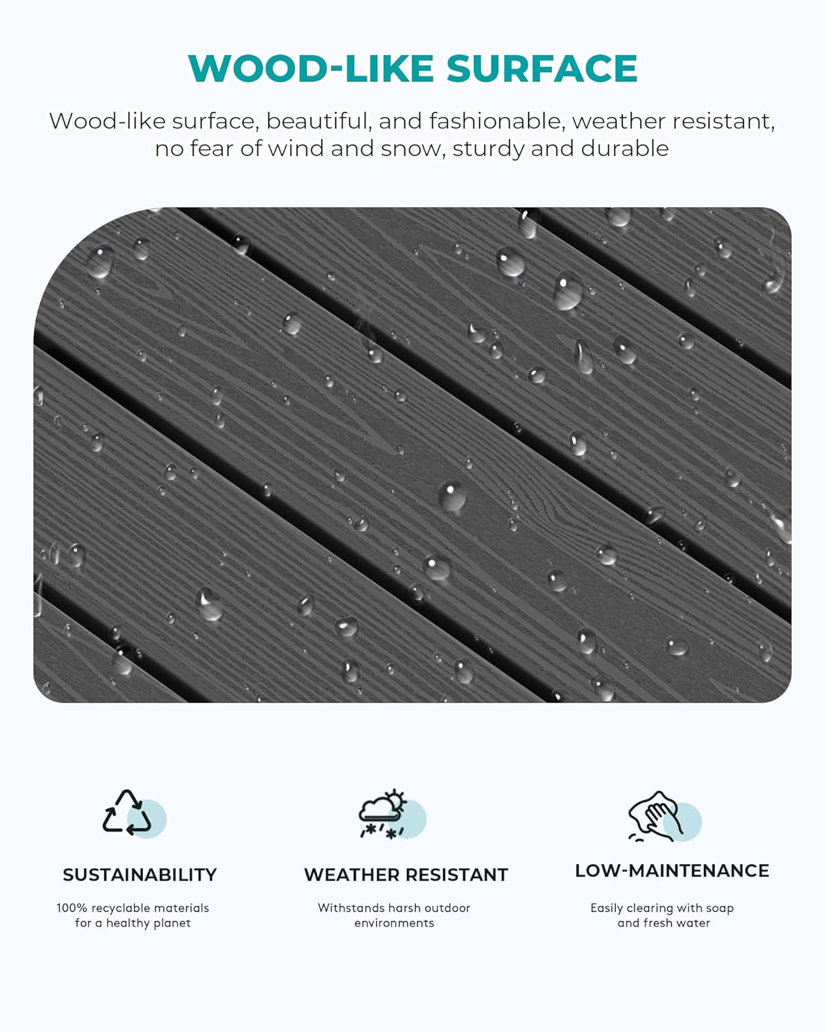 - Wood-like Texture: Offering the aesthetic appeal of wood without the upkeep, the SERWALL HDPE outdoor coffee table features a wood-textured surface that adds an elegant and natural touch to your outdoor decor. allowing you to have an outdoor experience just like real wood without the drawbacks of solid wood.