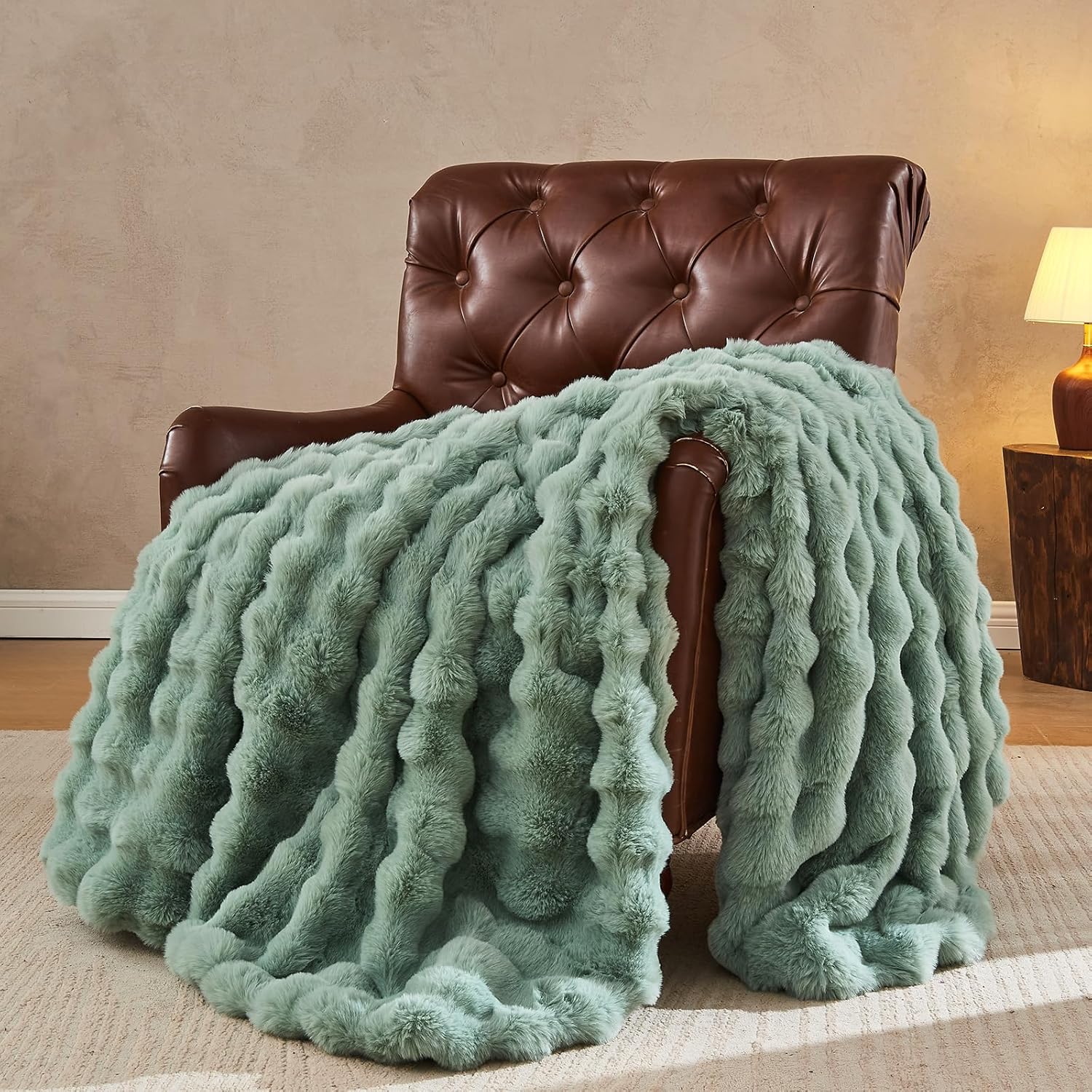 Lotus Karen Faux Fur Throw Blanket Sage Green - Big Bubble Rabbit Fluff Blanket for Couch Bed Sofa,Softest Fluffy Fuzzy Cozy Blanket,Plush Thick Furry Shaggy Warm Blankets for Women,60x80 Inches