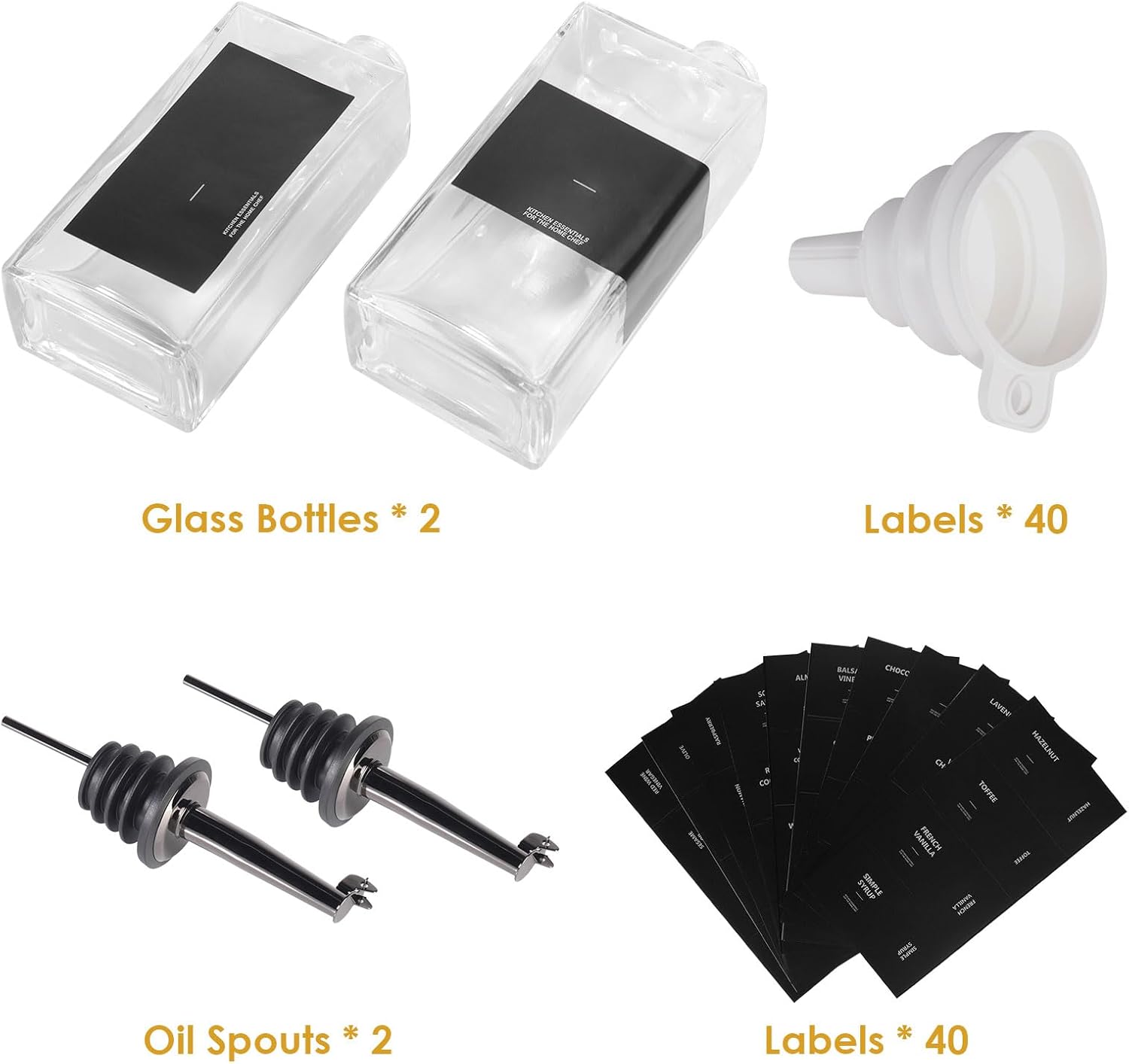 - [MODERN KITCHEN ESSENTIAL] The 40 black printed labels are waterproof, oil-proof, non-rolling, and tear-resistant, making it easy to differentiate your seasonings, and helping you find the right one while you are busy cooking. Also, the food-grade funnels solve the filling and refilling issue, making everything clean and neat, and the cleaning brush allows you to clean the oil decanter thoroughly. Don't worry about the oil stains! Last, the olive oil container set is also ideal for Outside BBQs, Picnics, Camping, Etc