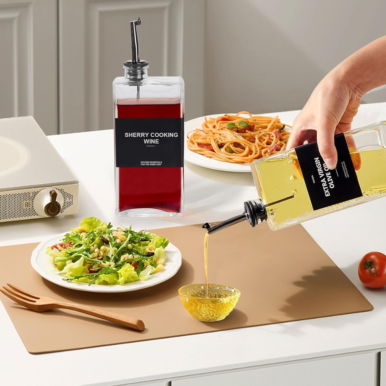 - [HIGH QUALITY & UPGRADE DESIGN] Our cooking oil container is made of superior quality BPA-FREE glass, combining a shatterproof body with a 304 stainless steel spout, rustproof and lightweight, ensuring controlled liquid flow, and preventing any spillage and leakages from staining your countertop. Moreover, each pouring spout has a seal ring, and the cap is fully closed when not in use, keeping your liquid ingredients fresh and original