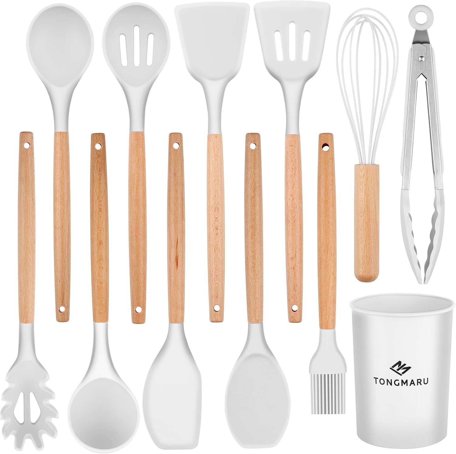 Silicone Cooking Utensils Set, Premium Beech Wood Handle Kitchen Gadgets Utensil Set, Non-Stick Kitchen Utensils Spatula, Tongs, Turner, Whisk, Brush, Spoon, BPA FREE, 446°F Resistant (White)