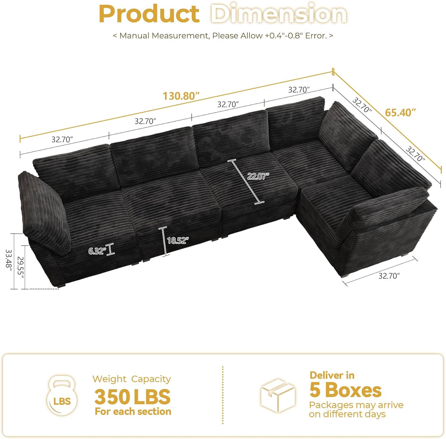 - Modular Sectional: 100% Free combination with 5 pieces individual sections. Make it straight I shape, U shape, L shape, bed shape, etc. Versatilely fits for daily use, family happy hours, party hosting