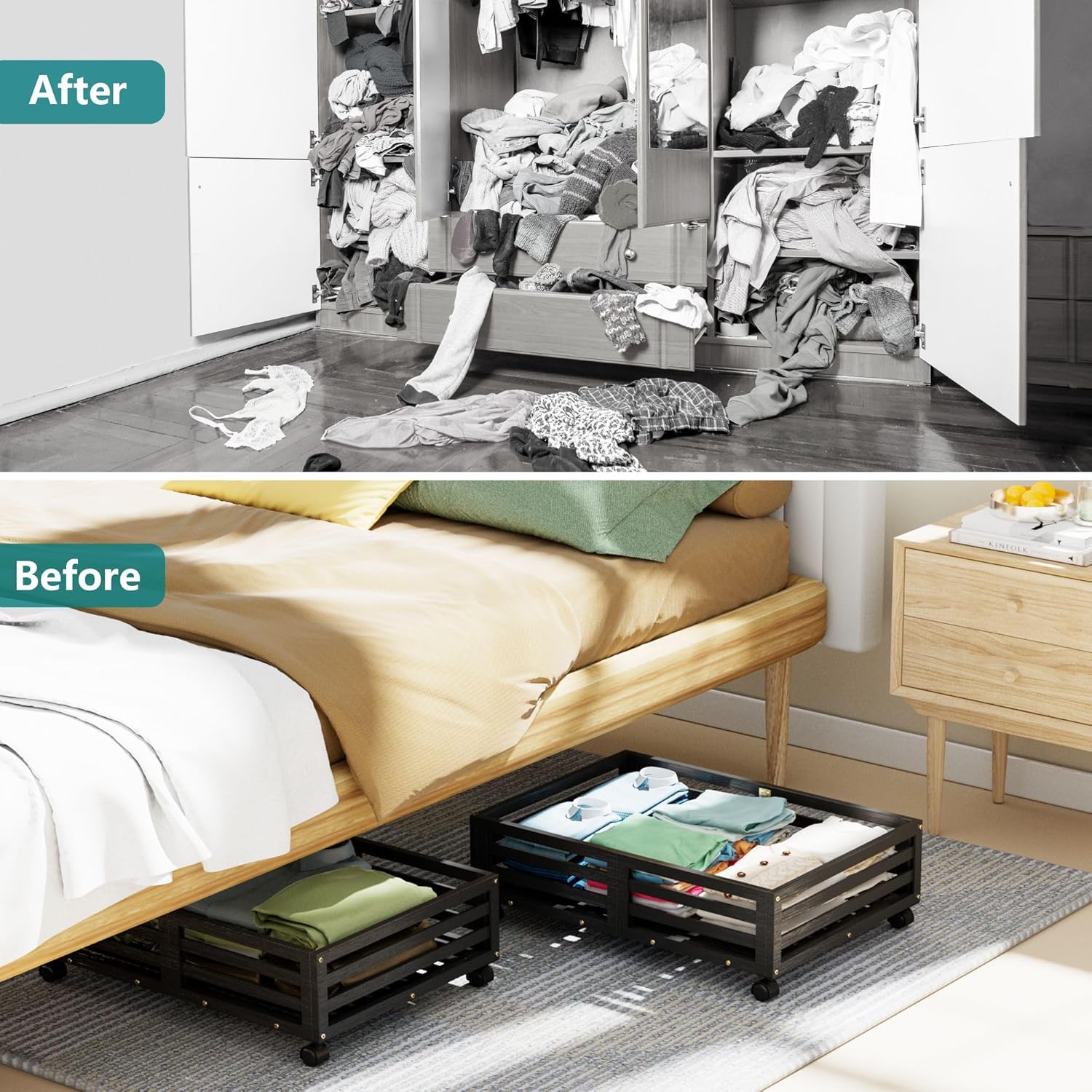 - π[Sturdy and Durable] Our under bed storage with wheels is crafted from premium wood bamboo, boasting 4 rotating wheels and a capacity of 120lbs. This 'under bed storage' solution includes non-woven bags for efficient organization of clothes, books, shoes, and toys.