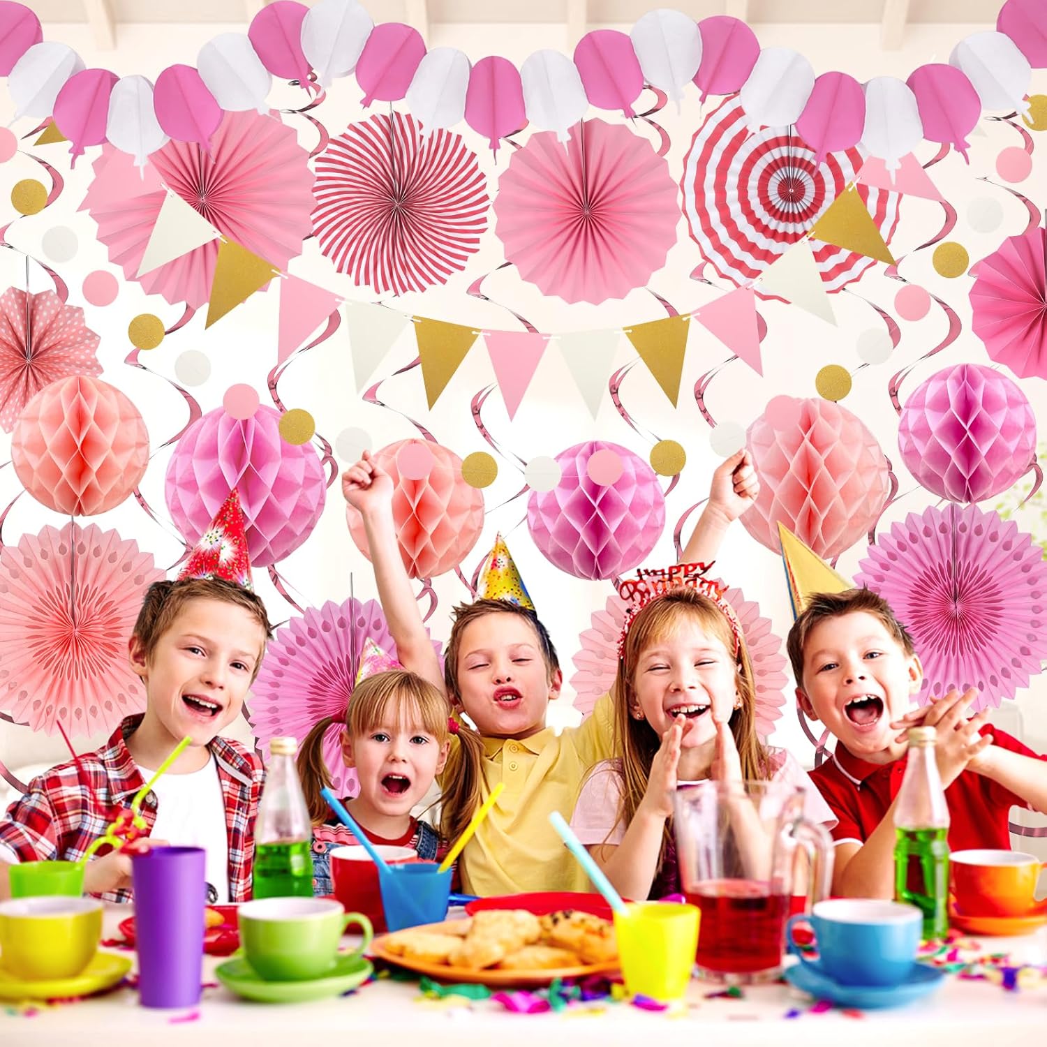 Pink Party Decorations, Easy Assembly Paper Fan Honeycomb Ball Garland Hanging Swirl Rose Red Party Supplies for Girl Women Birthday Bridal Shower Baby Shower Party Decorations