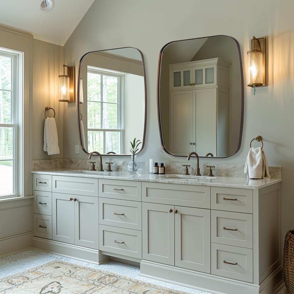 - Excellent Performance: A sleek, modern stainless steel metal frame surrounds a unique oblong mirror; sets it apart from traditional oval or rectangular mirrors; brushed bronze finish complements your bathroom; adds light and space to the room