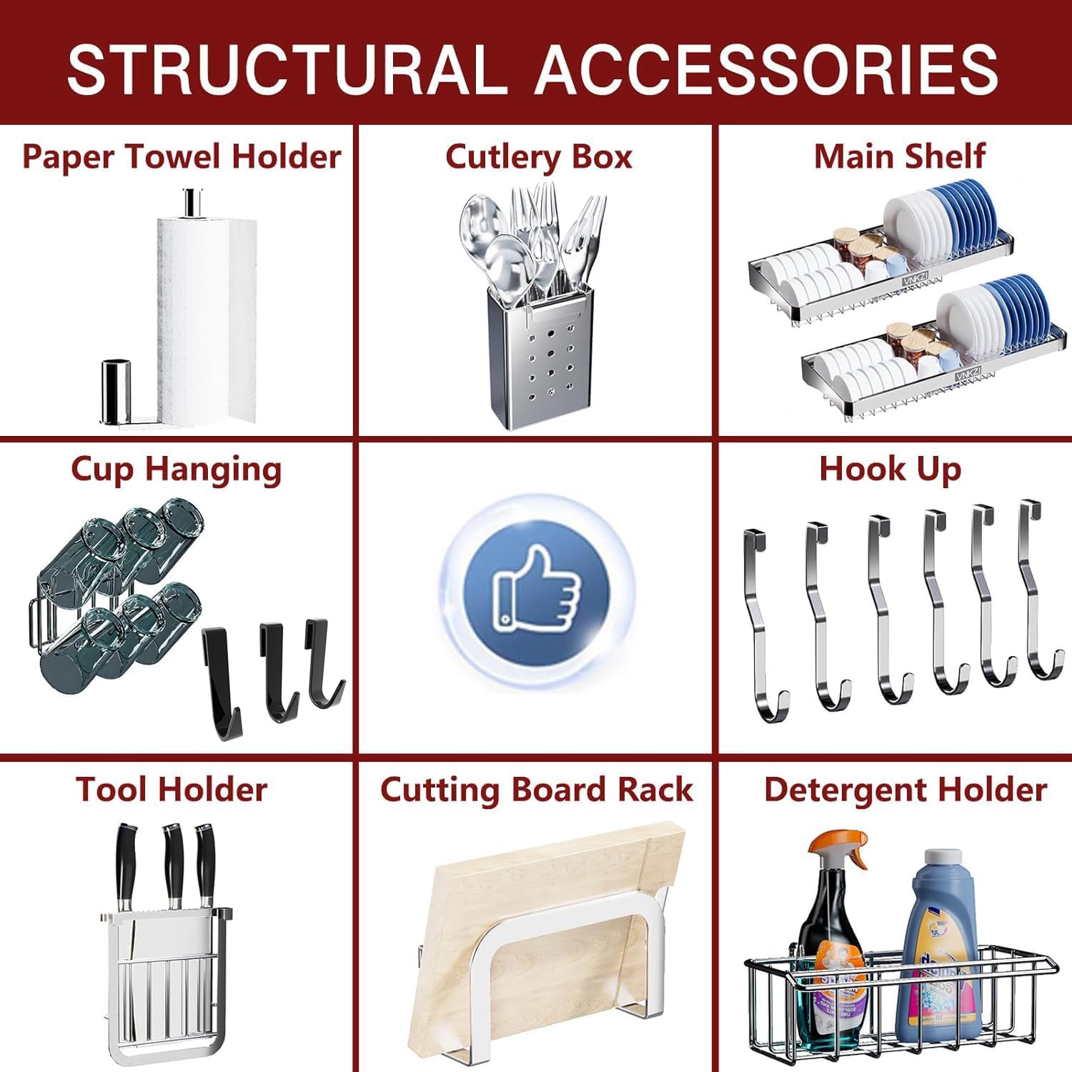 - FULL STAINLESS STEEL MATERIAL: made of 304 stainless steel, totally strong and sturdy, enoughthis over the sink dish rack is durable enough for long term use. Besides, its large capacity allows you to store all the tableware, while the over-the-sink design enables it to drain water directly into the sink, not onto the countertop, effectively avoiding water pooling. (Some Accessories Have a Protective Film On the Surface, Please Tear It Off Before Use.)