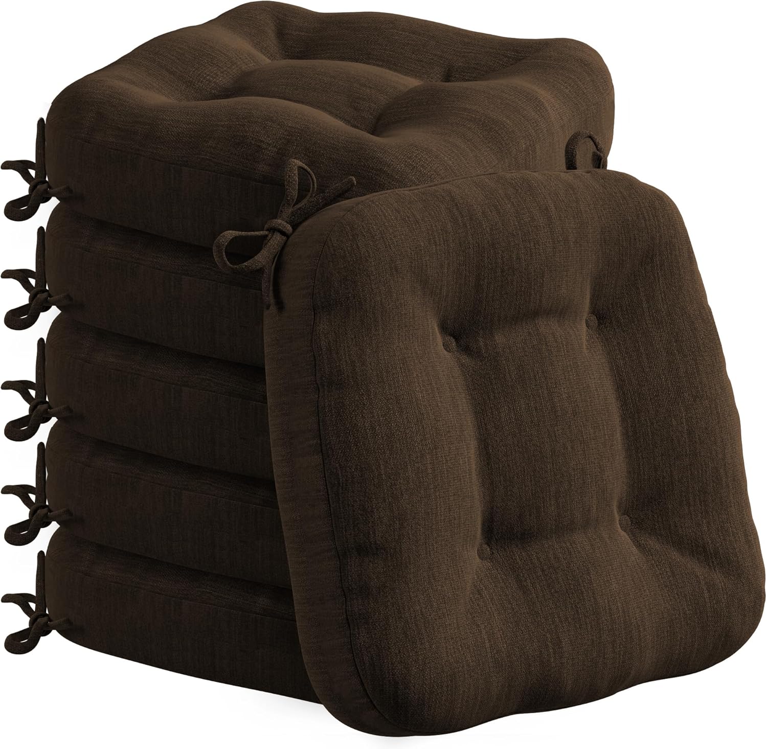 Codi 6 Pack Dining Chair Cushions, Thick Chairs Pads for Indoor Kitchen Room - Washable, Non-Slip Seat Cushion with Ties, 16.5"x16.5"x 3.5", Set of 6, Brown