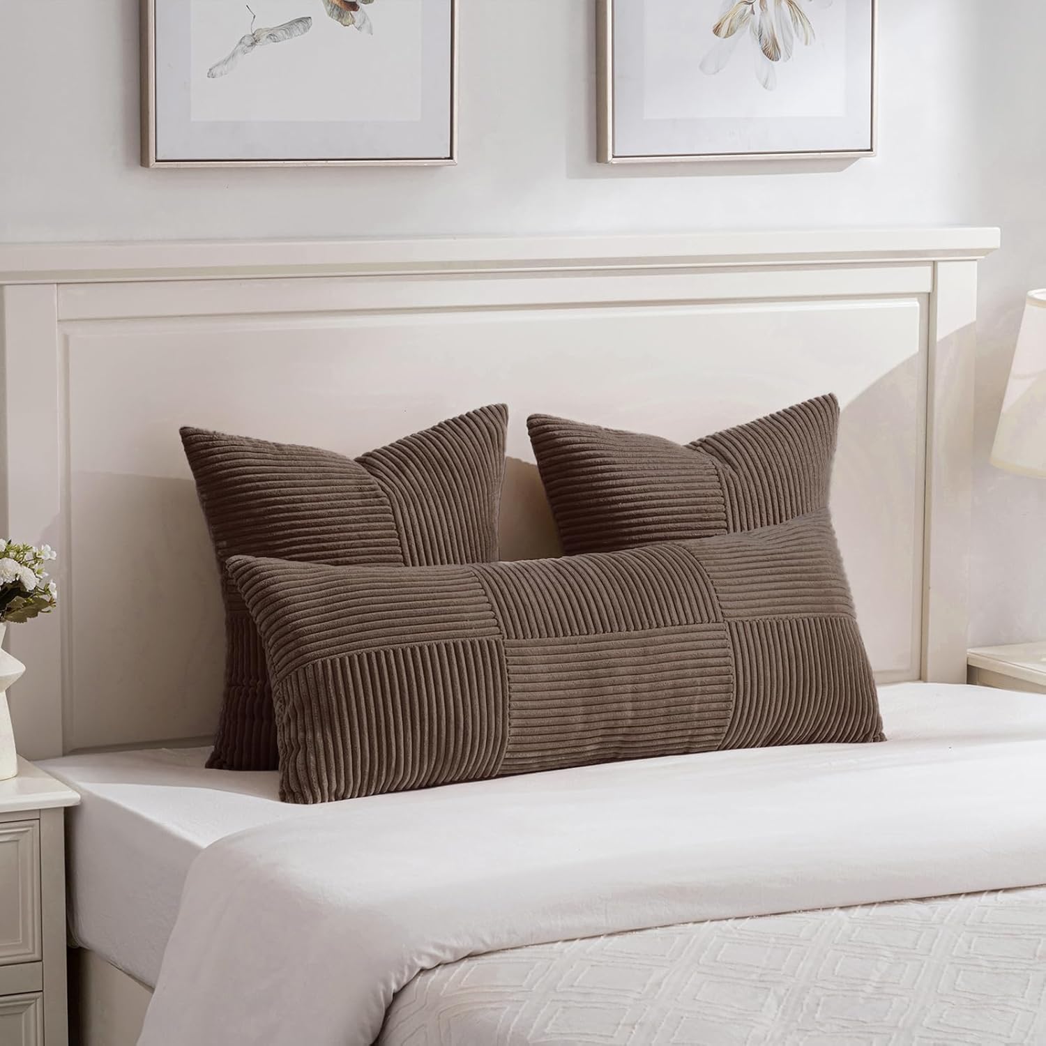 Fancy Homi Set of 2 Dark Brown Boho Long Lumbar Body Decorative Throw Pillow Cover 14x36 Inch for Bed Couch Bedroom Bench, Soft Patchwork Corduroy Textured Pillow Case, Rustic Farmhouse Room Décor