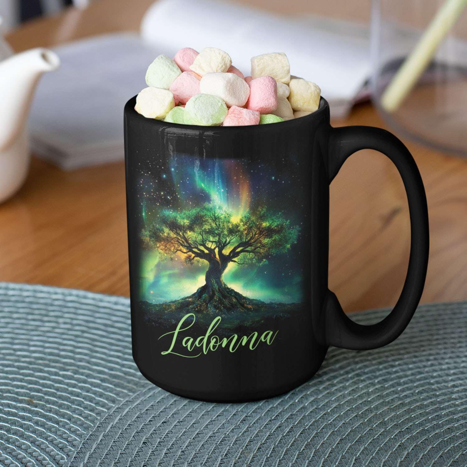 Custom Unique Name Coffee Cup, Customized Mystical Nature Inspired Mug 11oz 15oz, Personalized Enchanted Tree With Northern Lights Ceramic Cup, Nature Black Mug, Gift For Women Men