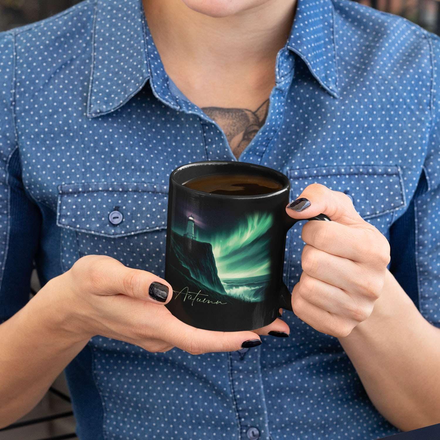 Customized Name Black Coffee Mug, Personalized Beautiful Northern Lights And Lighthouse Mug, Custom Mystical Ocean View Ceramic Cup, Gift For Women Men, Nature Themed Mug 11oz 15oz