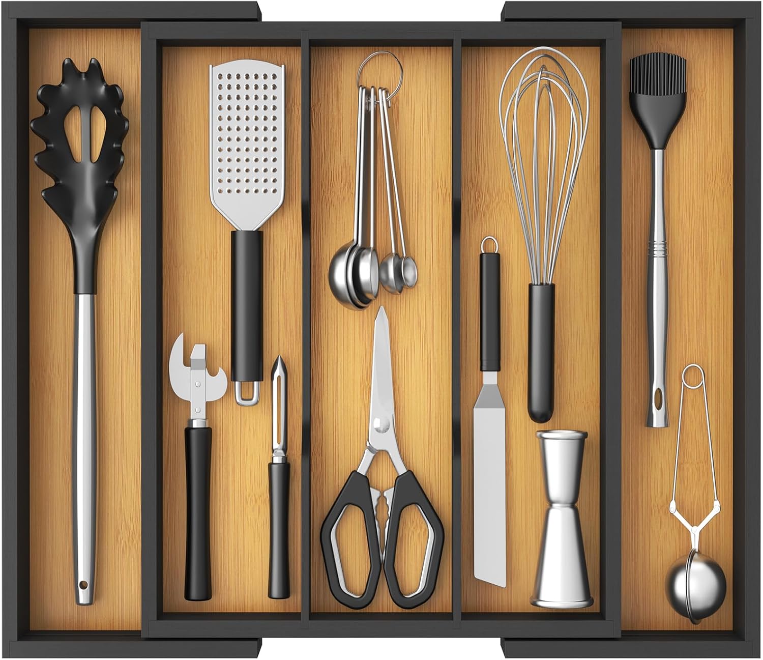 Lifewit Utensil Organizer for Kitchen Drawer, Bamboo Cooking Utensil Tray, Expandable Cutlery Silverware Flatware Holder, Adjustable Spatula Tools Gadgets Storage Divider, Large, Natural and Black