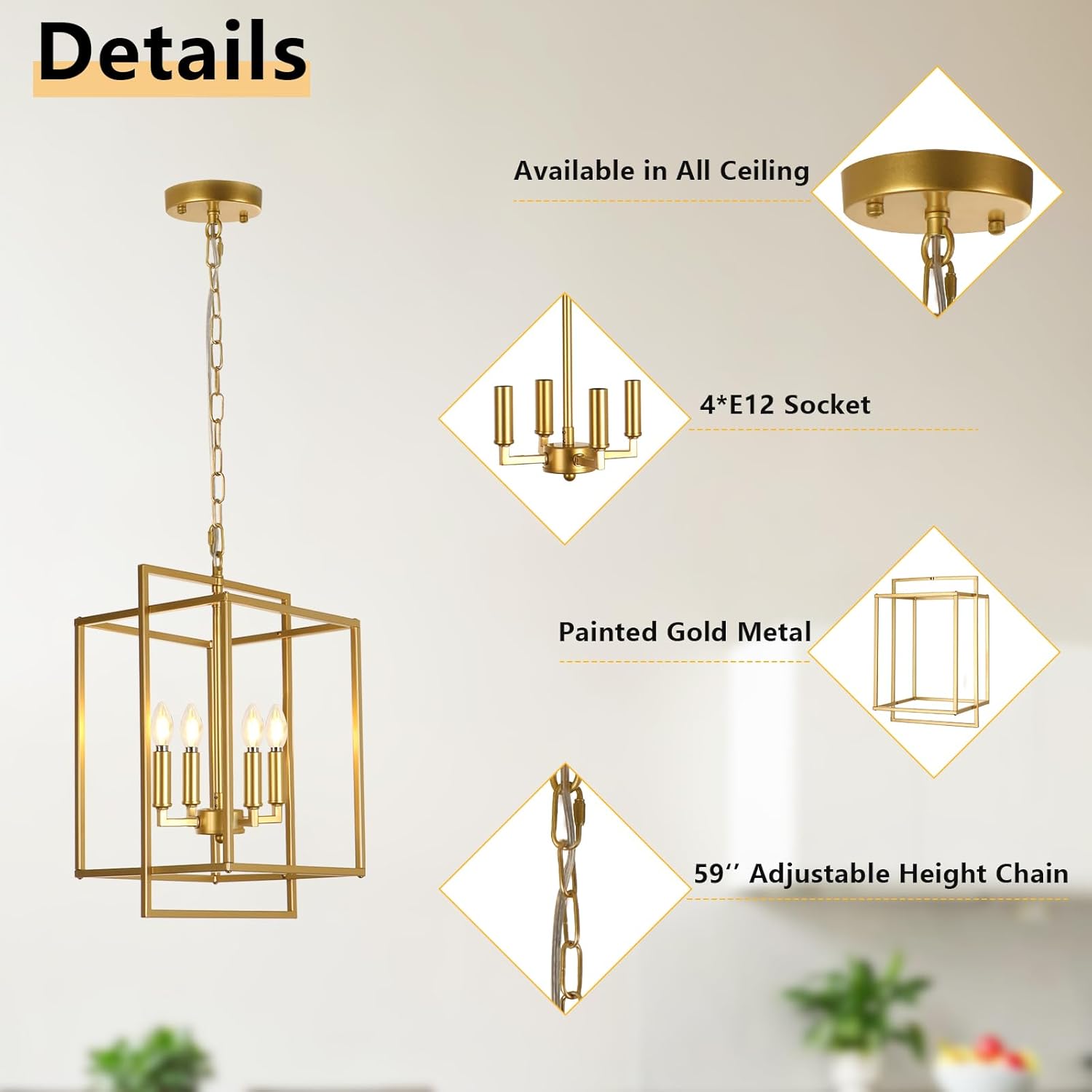 - Geometric Design: This farmhouse gold chandelier consists of a simple gold rectangular metal frame and a candle base. The appearance is clean and smooth, stylish and modern. Let the KMaiPem modern chandelier light up your life and add a touch of brilliance to your life