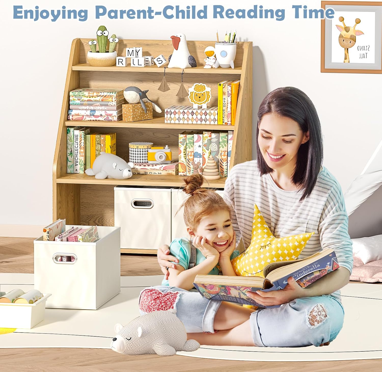 - ă2-IN-1 Kids Bookshelf and Toy StorageăThis kids' bookshelf is just like a magical treasure chest. Its 3 tier wooden rack provides a cozy place for books, while the 3 removable fabric drawers serve as secret pockets for toys. It caters to kids, from curious toddlers taking their first steps into the world of play and learning, to older children with a growing collection of hobbies. They can neatly store their books, toys, pens, and other cherished items. Each time your child opens it, they are greeted by the magic of stories and playthings, unlocking the door to boundless imagination.