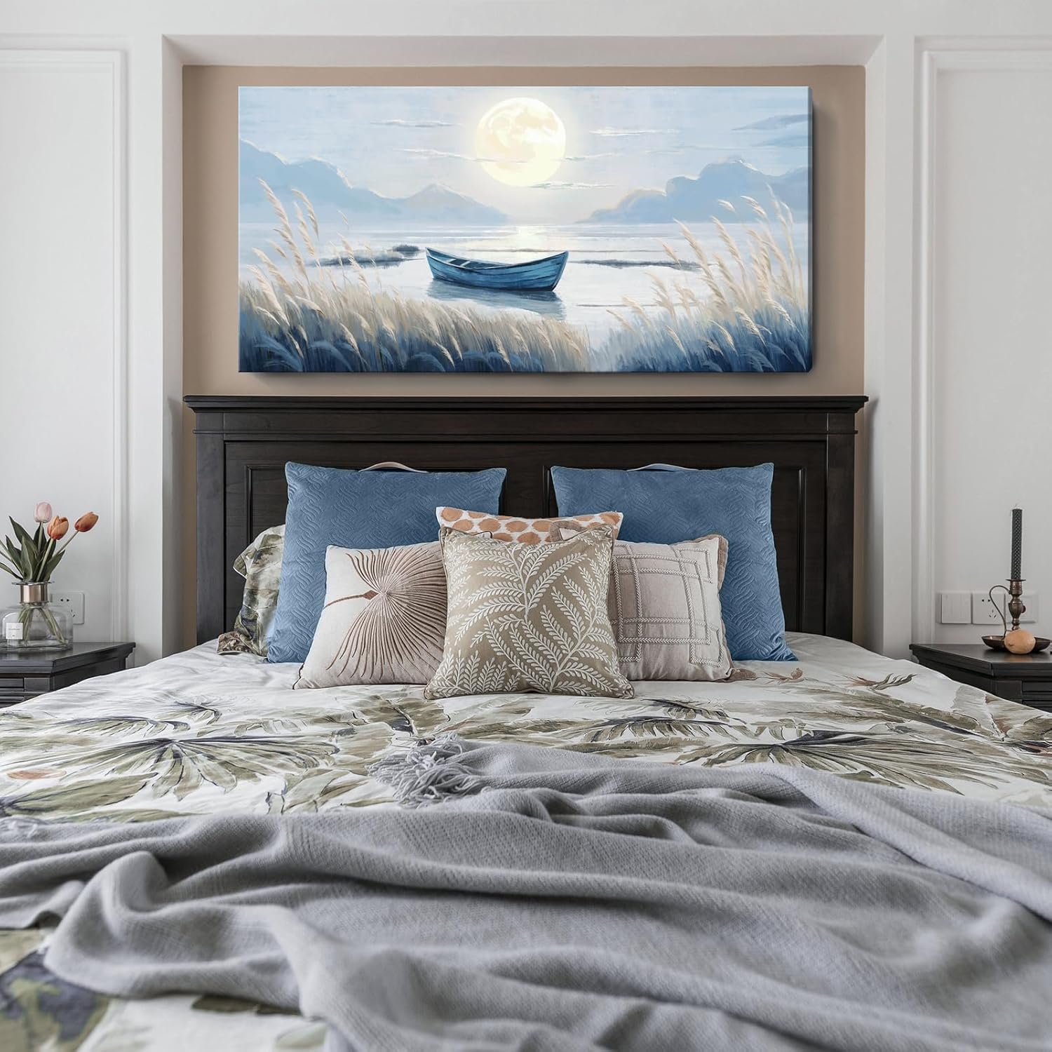 - Tranquil Wall Art for Every Space: Transform your space with this stunning large coastal wall art, featuring a serene moonlit lake, a glowing moon, and a peaceful boat. Perfect for infusing a touch of beach-inspired elegance into your living room, bedroom, dining room, or office. Whether you're seeking a calming focal point or a soothing atmosphere, this extra large blue and white artwork effortlessly enhances any room with its tranquil beauty.
