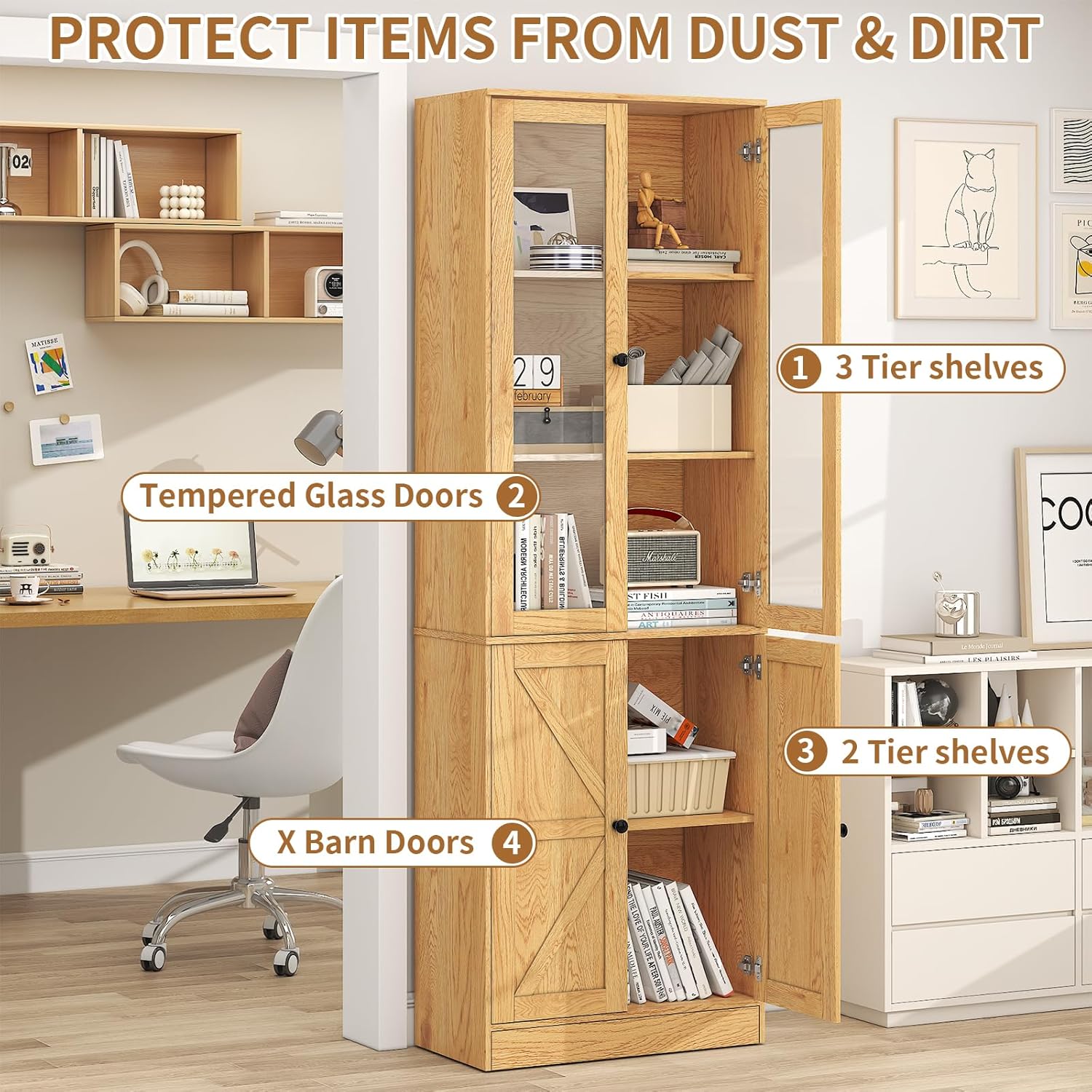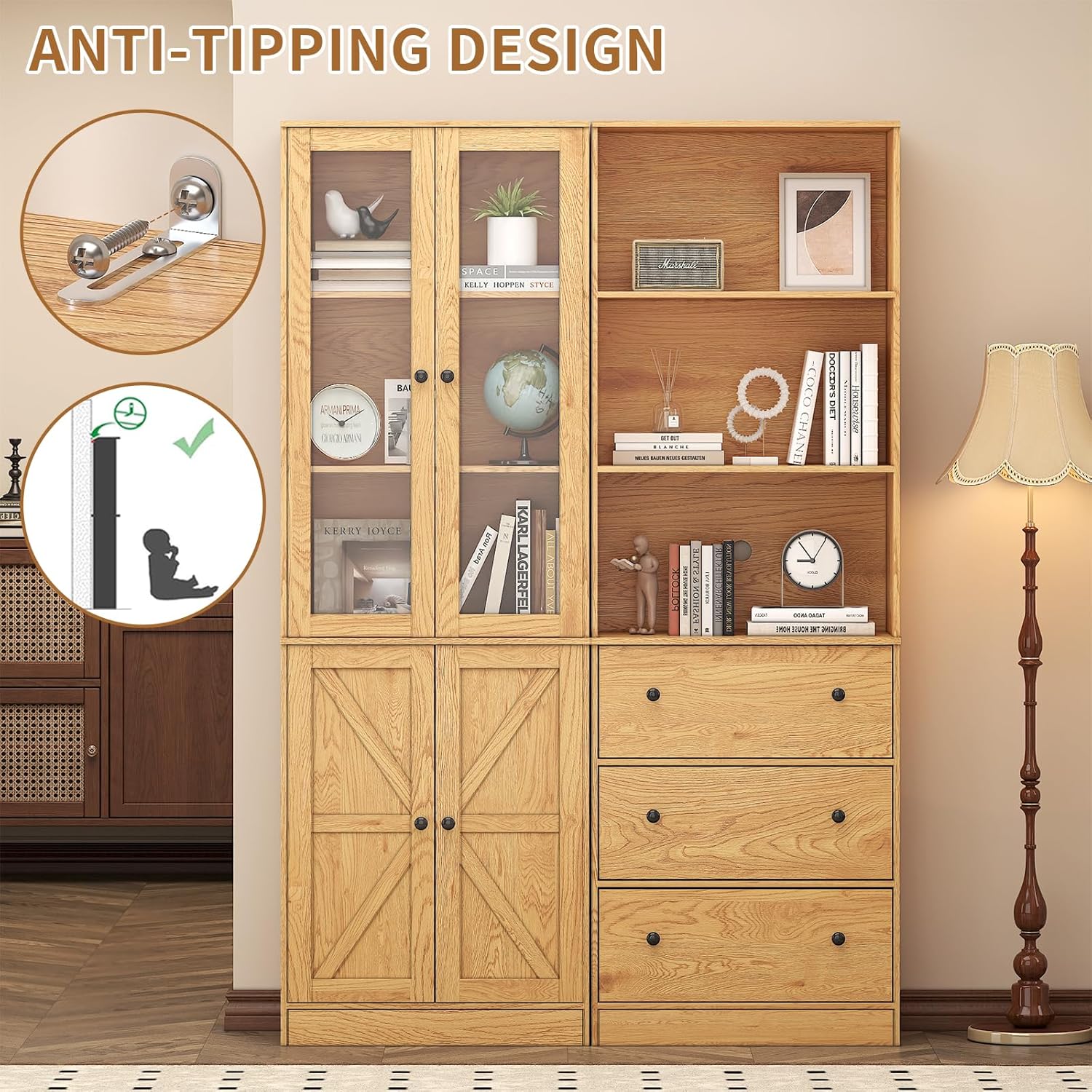 - 【Multifunctional Use】- The bookshelf with storage is designed with wood grain style and minimalist aesthetic, it seamlessly fits into any decor style. These wooden bookcases can be used as display cabinets, office bookshelves, library bookcass, kitchen pantry cabinets, etc