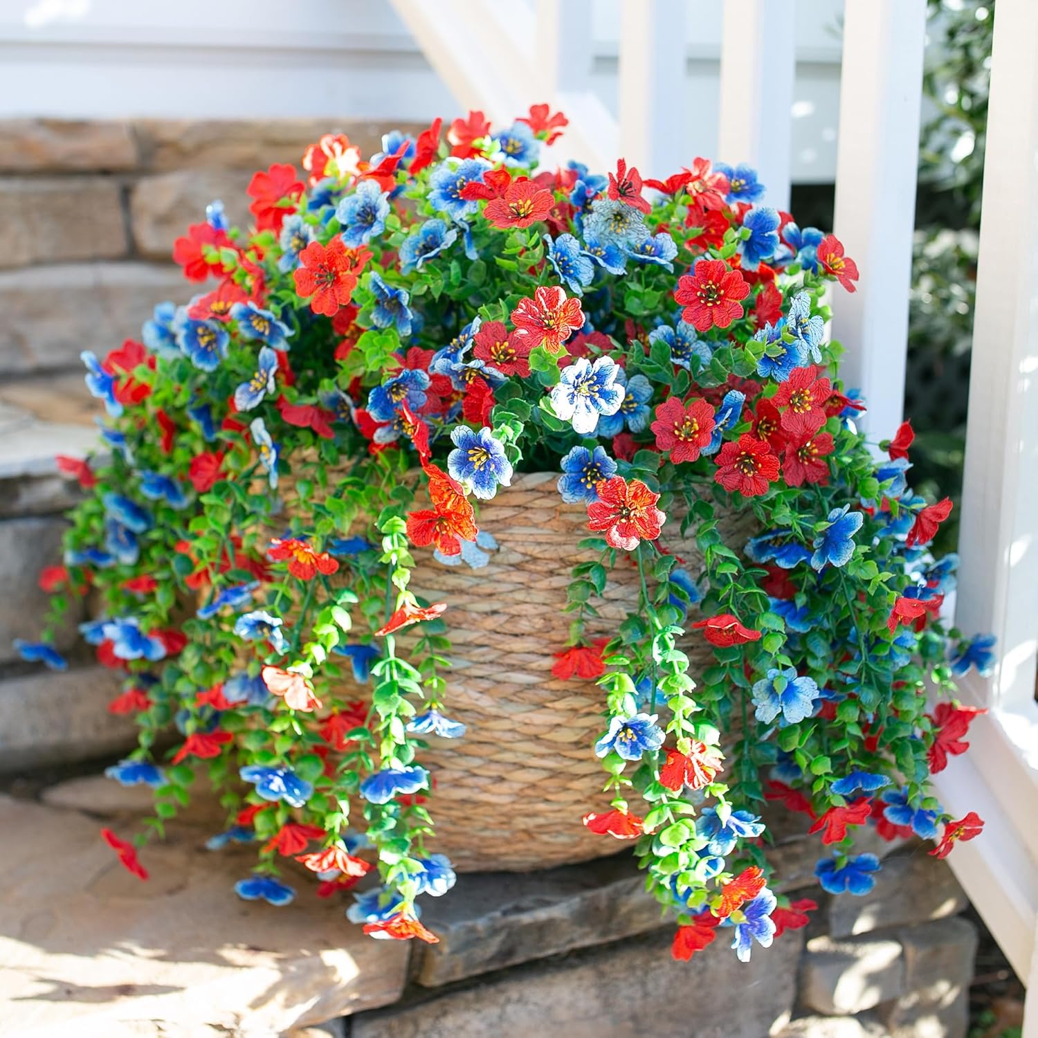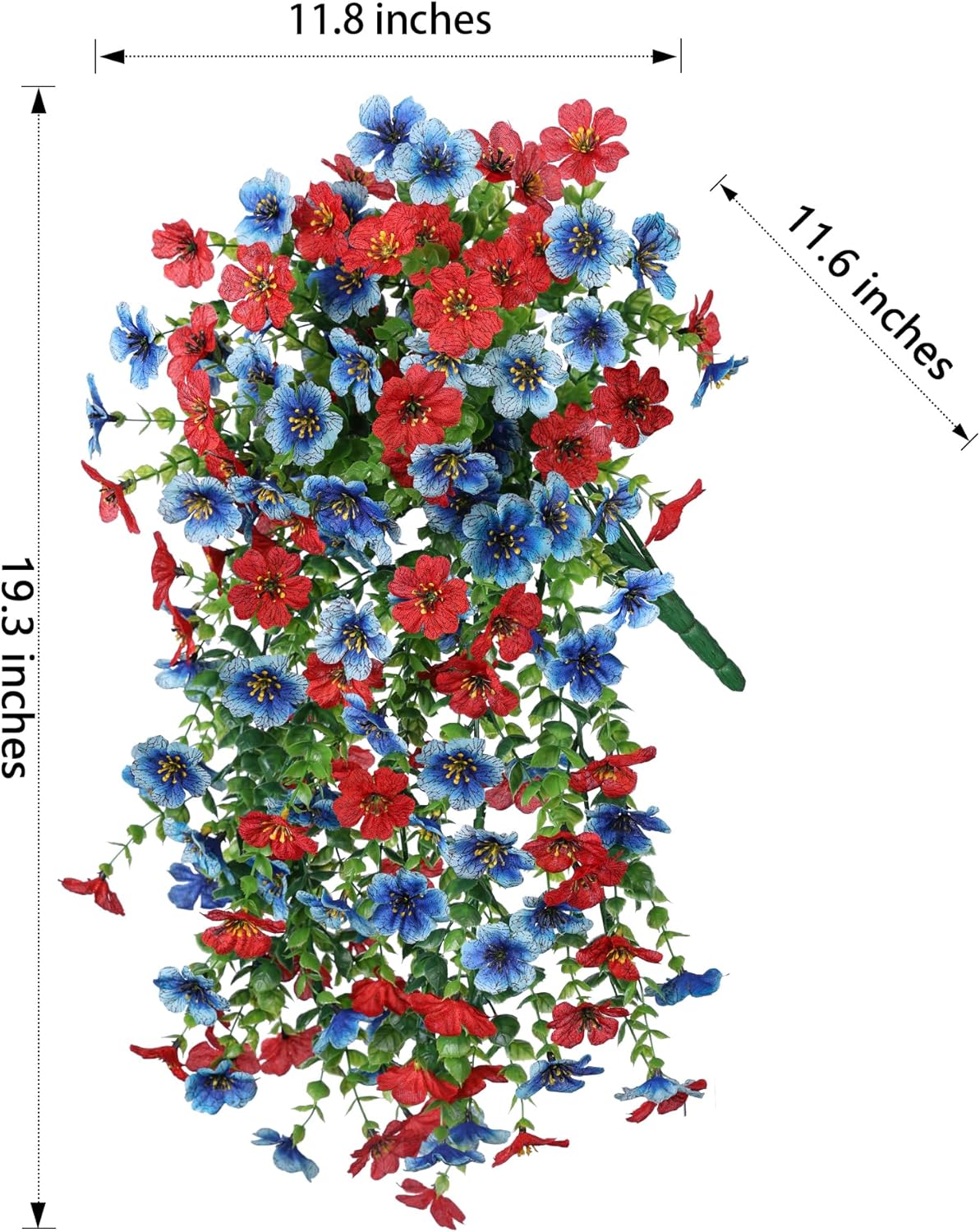 INSPRING Artificial Faux Hanging Flowers Plants for Spring Outdoor Outside Decoration, 2 PCS Fake Silk Daisy with Eucalyptus UV Resistant Realistic Trailing Vines for Balcony Patio Porch (BlueRed)