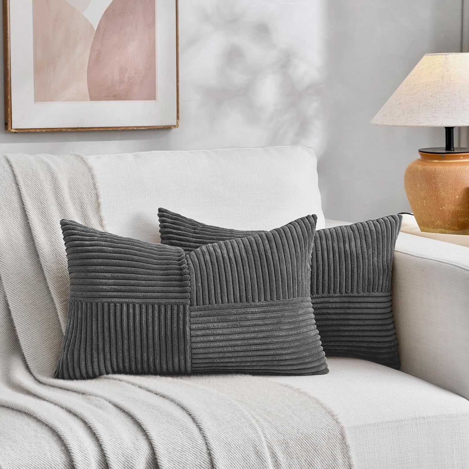 Fancy Homi 2 Packs Dark Gray Lumbar Decorative Throw Pillow Covers 20x28 Inch for Living Room Couch Bed Sofa, Farmhouse Home Decor, Soft Striped Corduroy Rectangle Accent Cushion Case 50x70 cm