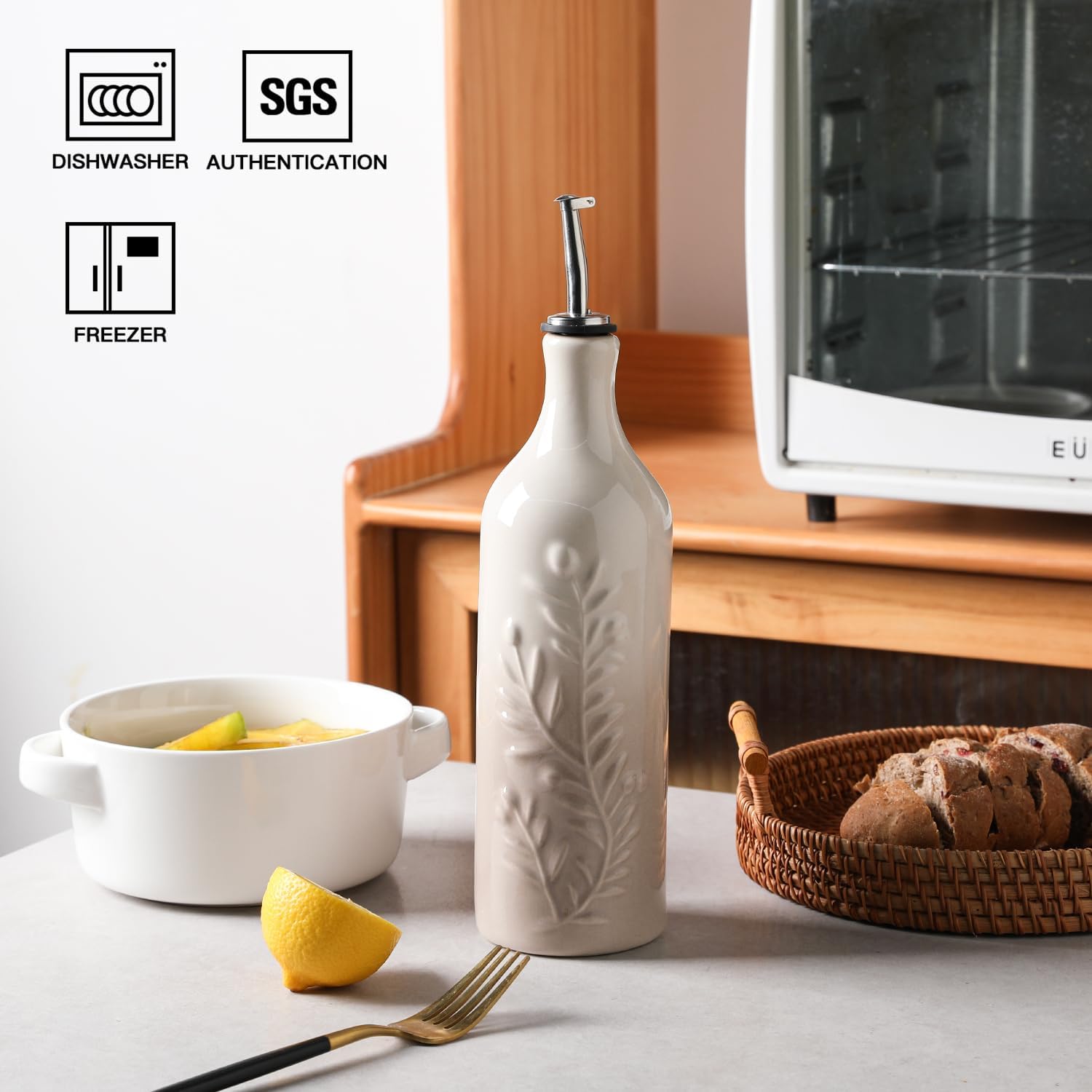 - Durable and Precise Pouring Control - The olive oil bottle fired at high temperatures, to form a smooth glazed surface, strength and durability. The carefully designed spout that allows for easy pouring without any messy drips or spills.