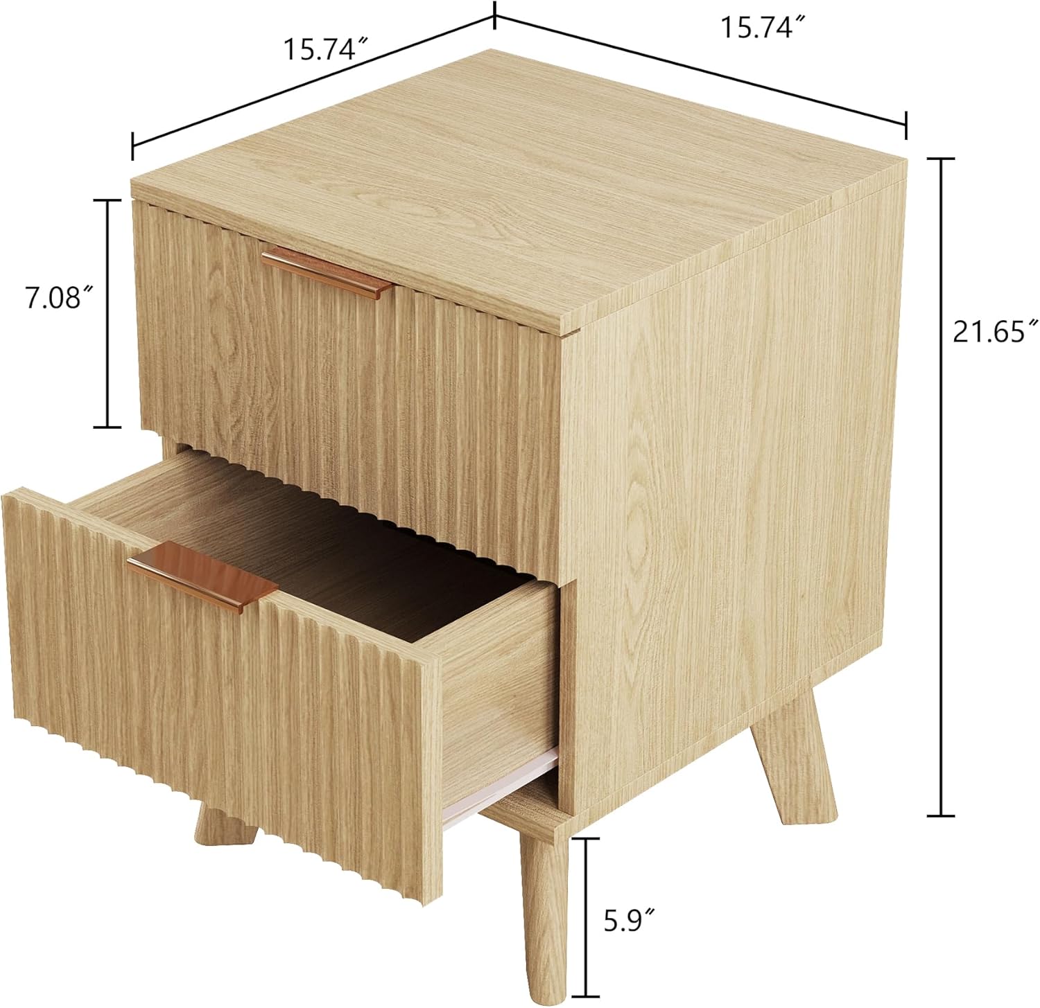 Fluted Nightstands Set of 2, Mid Century Modern 2 Drawer Dresser for Bedroom, Small Night Stand Side Table End Table with Wood Drawer Storage for Bedroom Closet, Natural
