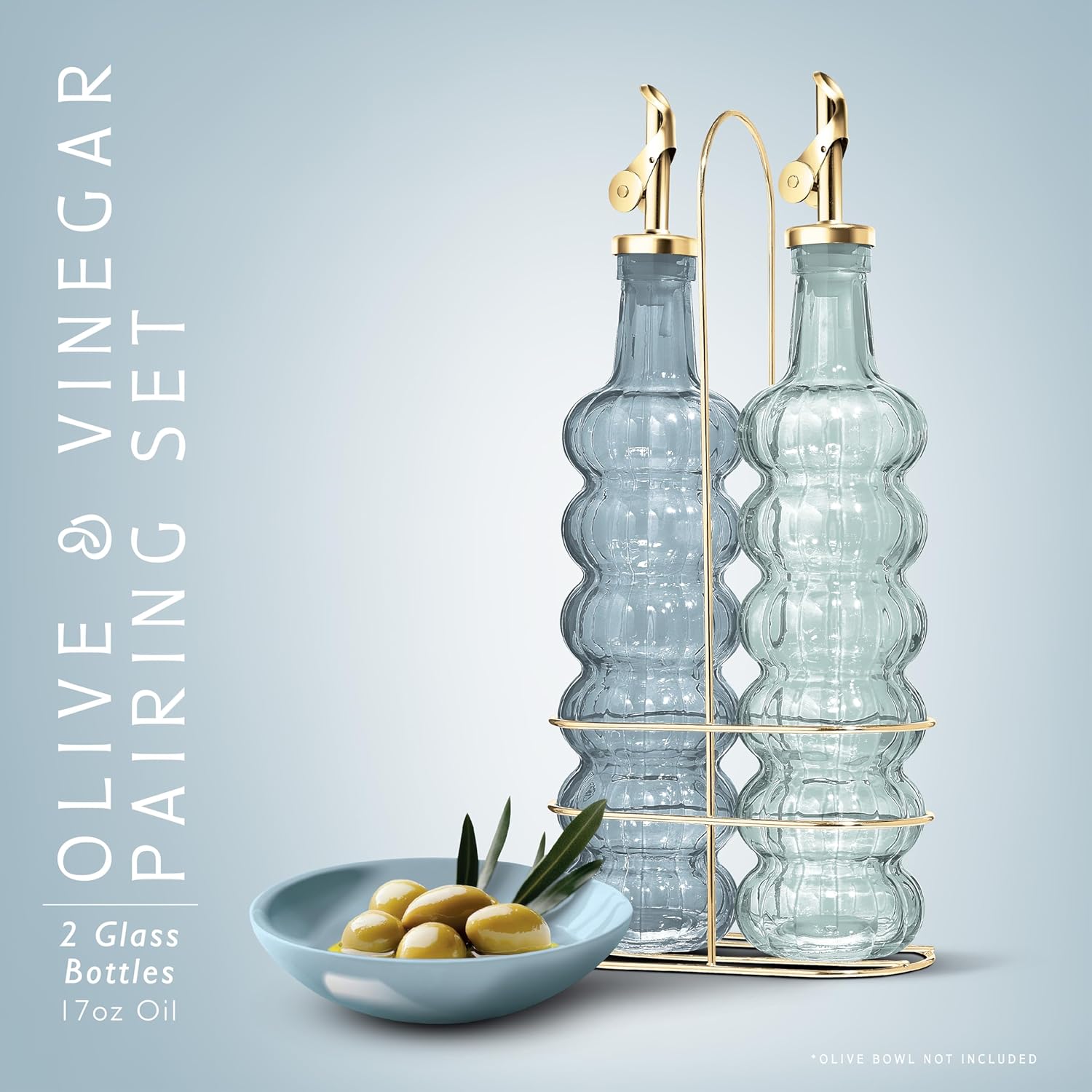 - Beautiful and Functional - Our colored glass oil dispensing bottles, with elegeant colors, gold tops and gold wire rack, will elevate your kitchen. Don't use just any oil bottle, upgrade the way you cook. That's our mission.