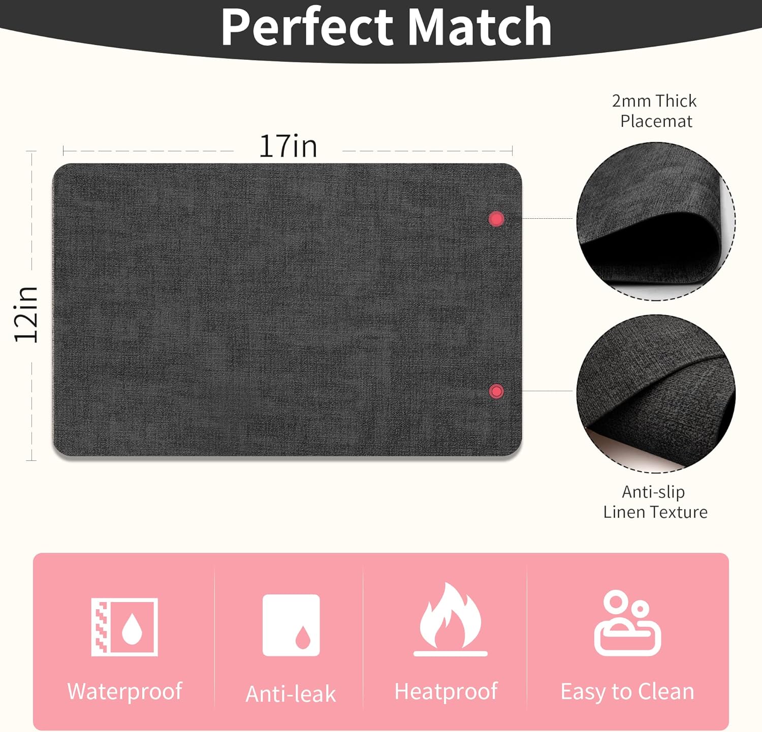 - HEAT RESISTANCE - UP TO 212 °F (100 °C): These quality dining table place mats are with 2mm thickness to protect your dining table from white heat marks. Each is sealed with a durable coating that is both stain and heat resistant to 212 °F.