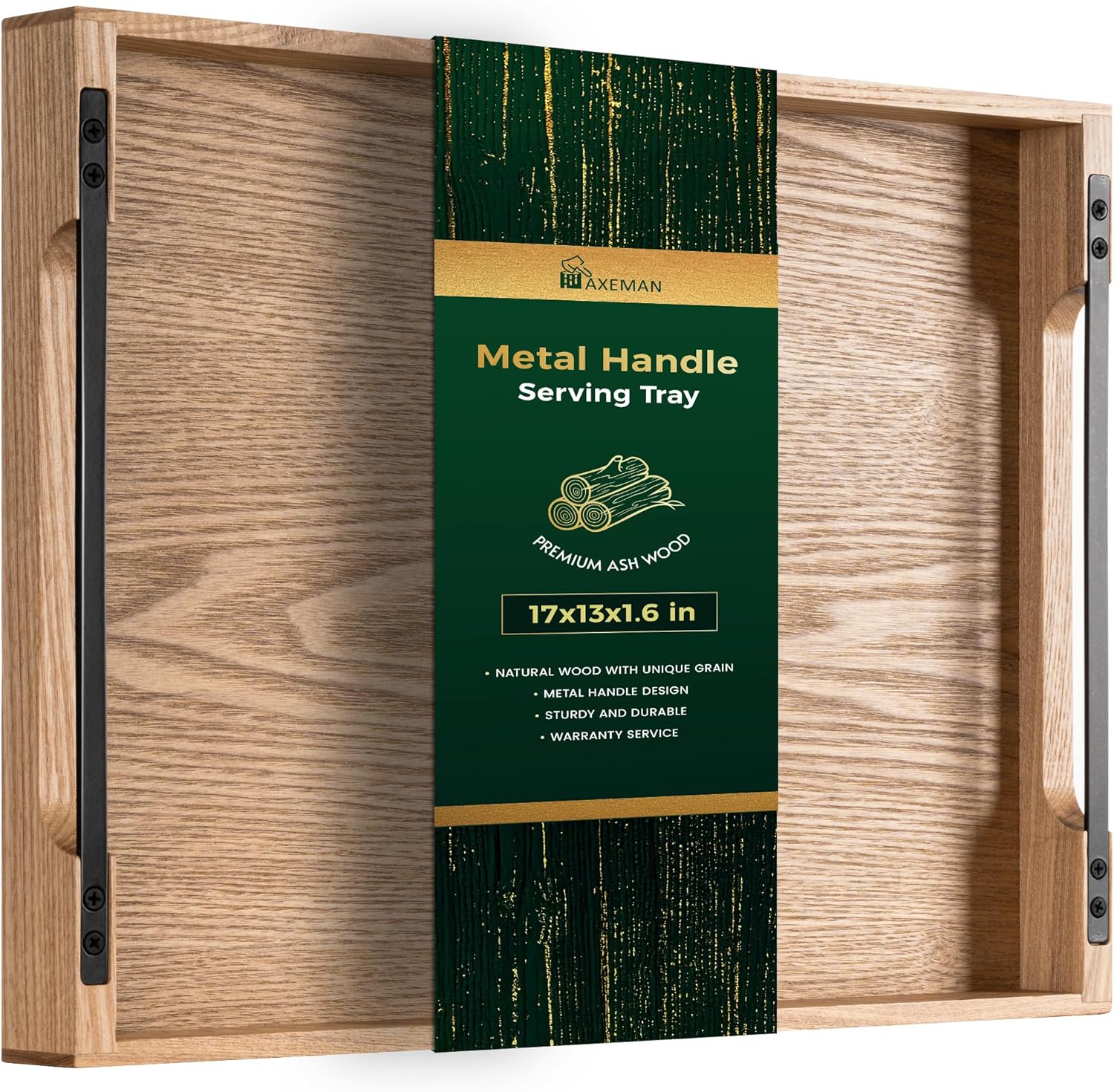 Axeman Wooden Serving Tray with Metal Handles|Ottoman Tray for Breakfast, Bed, Couch|17x13in Ash Wood Coffee Table Trays|Food Drinks Decorative Storage Boards for Ottoman Kitchen, Natural