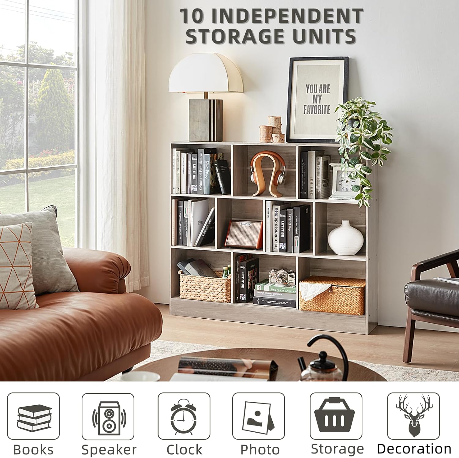 LEYAOYAO 10 Cube Bookshelf with Base,3 Tier Mid-Century Modern Grey Bookcase,Standing Wide Bookshelves Storage Organizer Shelf,Rustic Wood Display Cabinet Book Shelves for Bedroom,Living Room,Office
