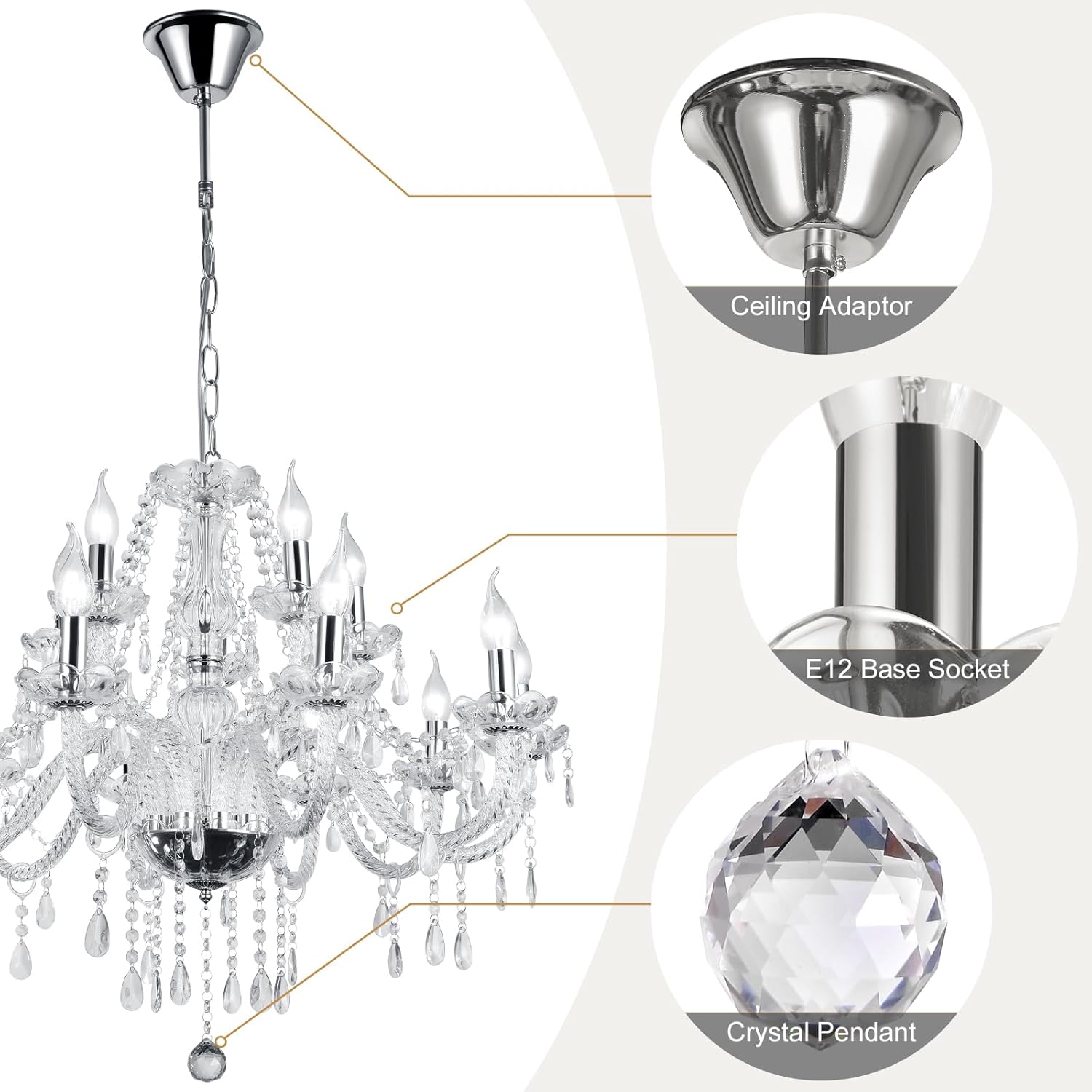 Modern Elegant 10 Lights K9 Crystal Glass Chandelier Silver Pendant Ceiling Lighting European Style for Dining Living Room Bedroom Transparent, 10 E12 Bulbs Required